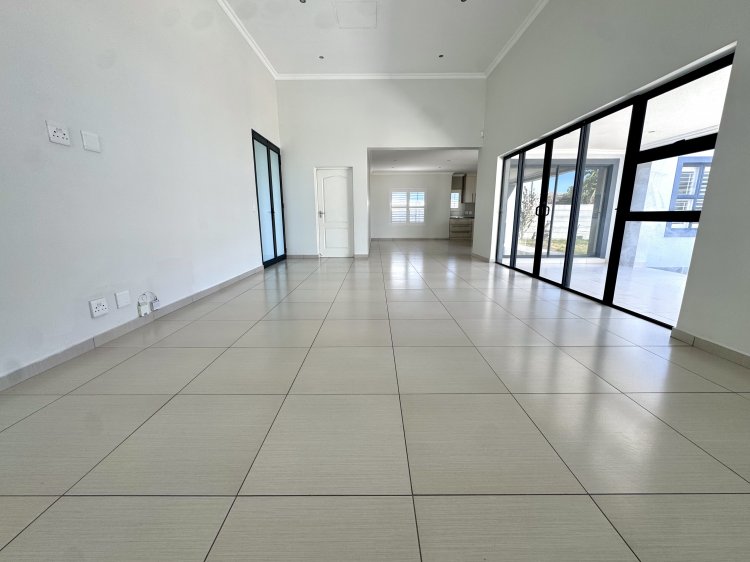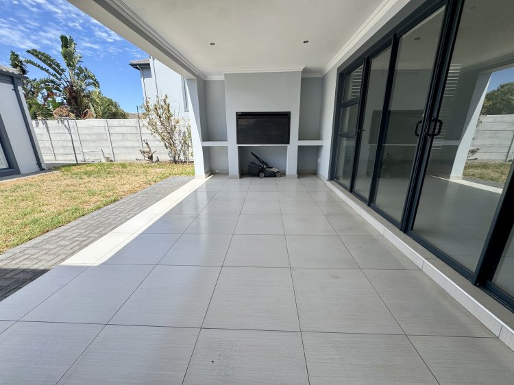 The contemporary kitchen is designed for effortless entertaining, featuring space for a large double-door fridge and a separate scullery with three water points to keep the main living area sleek and uncluttered. Open-plan living areas flow seamlessly to a covered braai and entertainment space, creating the ideal setting for hosting and relaxed family gatherings.