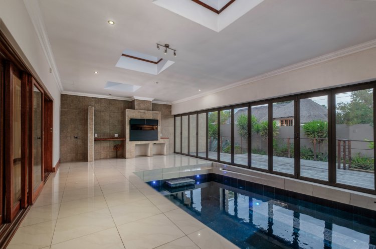 Living & Entertaining Downstairs, the heart of the home unfolds into a warm, seamless, and inviting living space. The open-plan dining room flows effortlessly into the kitchen and lounge, creating a connected environment where family and friends naturally come together. The well-appointed kitchen is both stylish and practical, featuring: • A central island with granite countertops • An abundance of cupboard space, including a sliding pantry • Top-of-the-range appliances such as a gas hob and electric stove. • Thoughtful finishes that make everyday living effortless and enjoyable Designed for those who love to entertain, the home boasts an exceptional private entertainment area complete with a built-in gas braai, an indoor pool, and a truly unique underground wine cellar with a cigar lounge creates a sophisticated setting for hosting unforgettable gatherings. Stacking doors open onto a private deck, ideal for relaxed Sunday lunches, sunset views, and fresh air shared with loved ones.