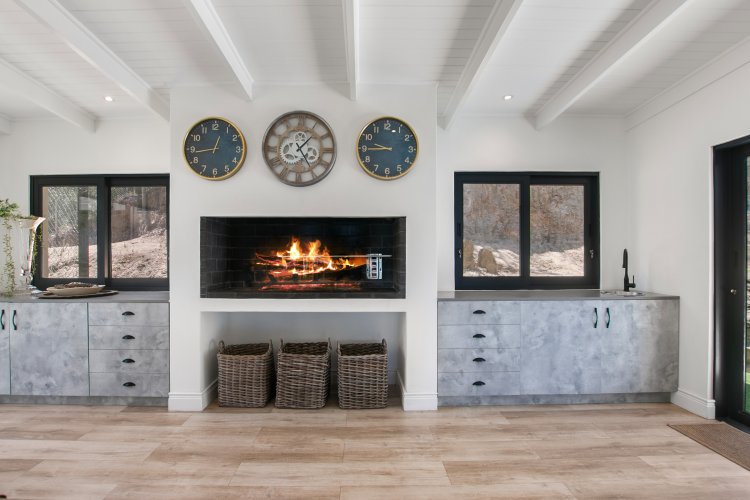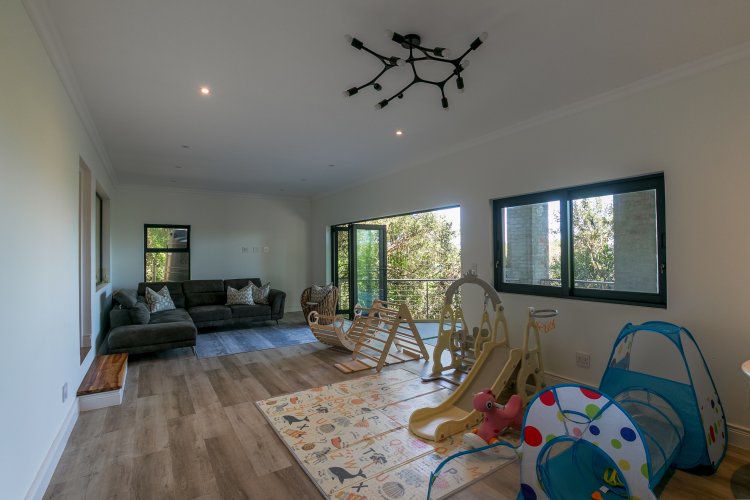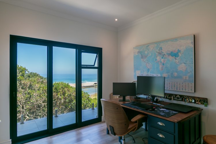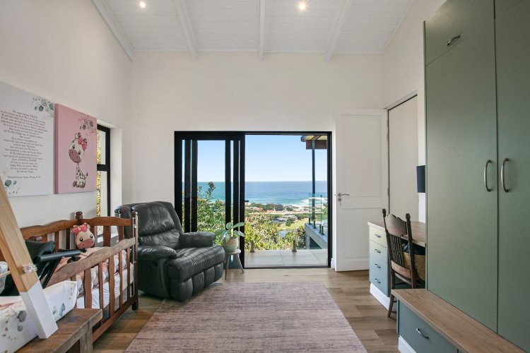 The upper level is designed for effortless living and entertaining, featuring expansive open-plan living and dining areas with a built-in fireplace, and built in braai, creating a warm and inviting atmosphere year-round. These spaces flow seamlessly onto a large balcony, where magnificent coastal and river views provide a breathtaking backdrop. The well-appointed kitchen is both functional and elegant, complete with a pantry and separate scullery, ideal for relaxed family living or hosting guests.