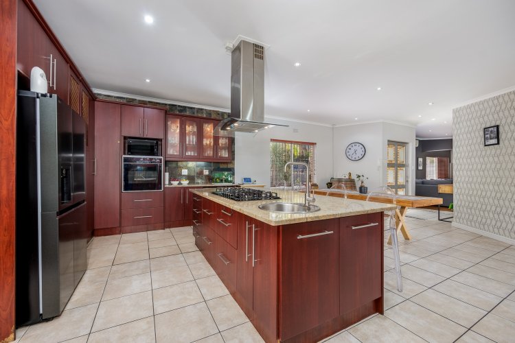 The open-plan kitchen and dining area flow effortlessly into the indoor braai room, creating a welcoming hub for family living and entertaining. This expansive area comfortably accommodates a second lounge and dining space, which opens onto the swimming pool and a beautifully maintained garden.