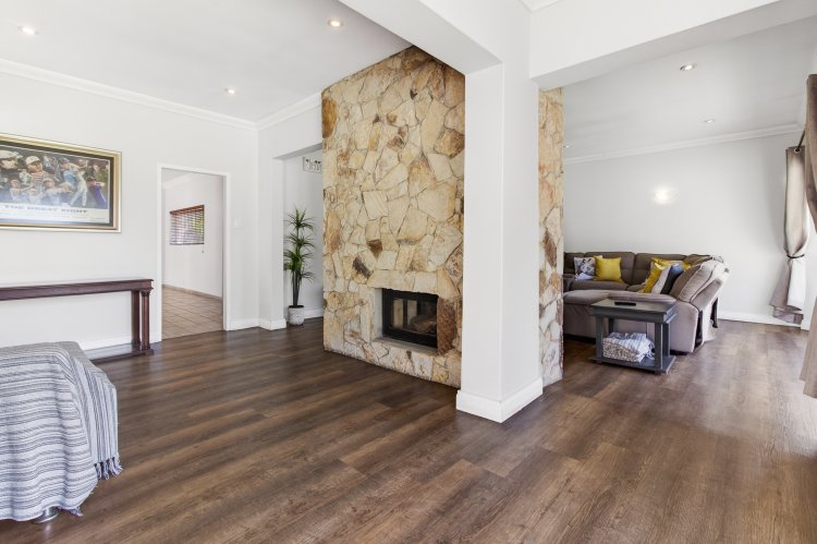 Welcoming & Elegant Living Spaces • Charming country-style courtyard garden leading into a grand, light-filled entrance hall • Private study positioned just off the entrance — ideal for working from home • Generous formal and informal living areas, separated by a striking double-sided fireplace • Seamless indoor-outdoor flow via stacker doors to a covered entertainer’s patio overlooking the pool and garden