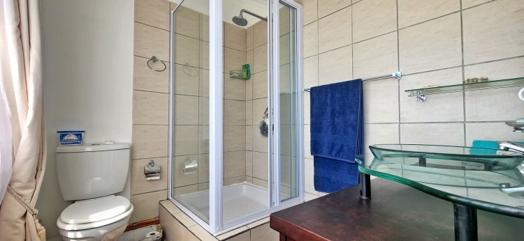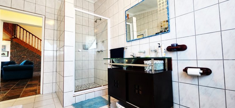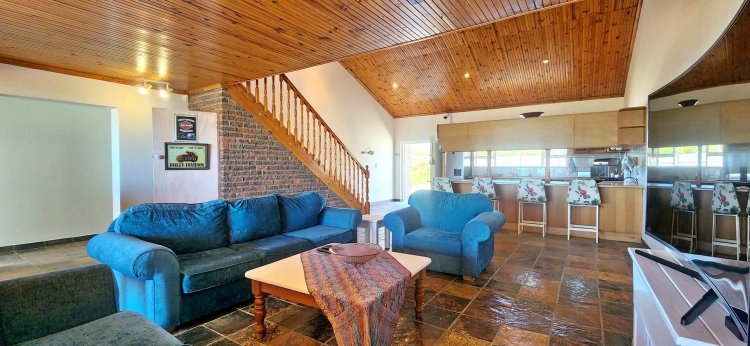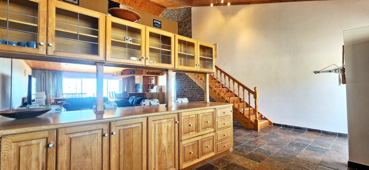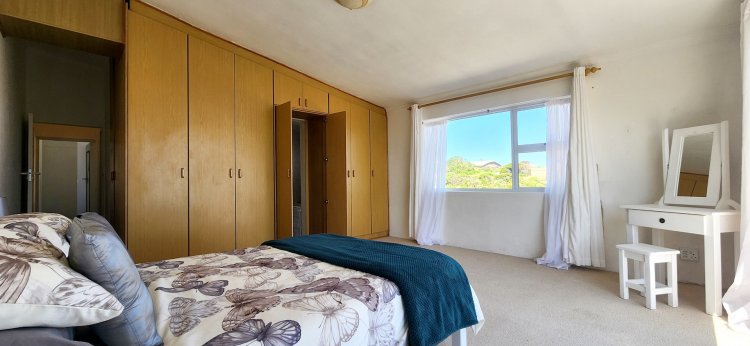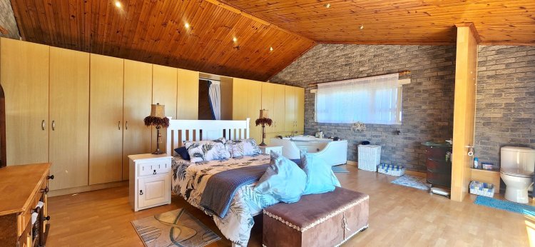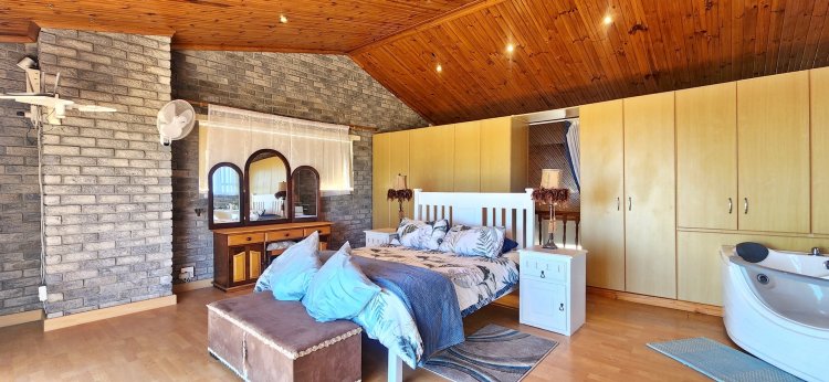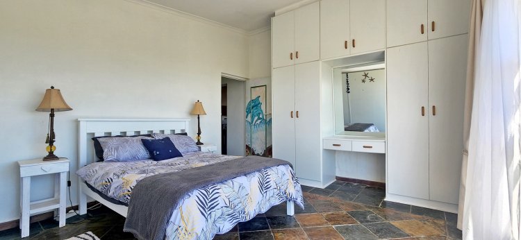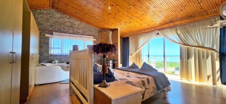 Upstairs, a loft-style master suite is a true retreat, featuring an open-plan bathroom and access to a private balcony showcasing panoramic views over Suiderstrand and the coastline. For added convenience and security, the double garage connects directly to the home.