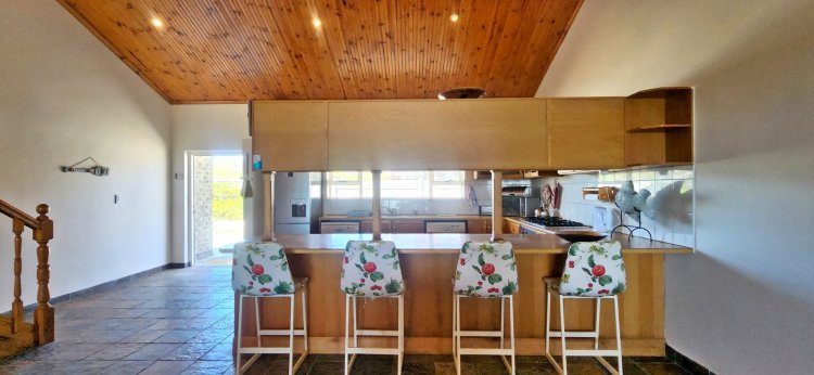 Step inside to find a spacious open-plan living area and kitchen, complete with a built-in bar that flows effortlessly onto a patio overlooking the ocean. Downstairs, four well-appointed bedrooms await, including two with ensuite bathrooms and a full family bathroom for guests.