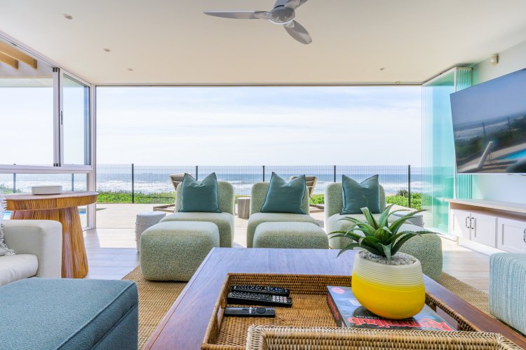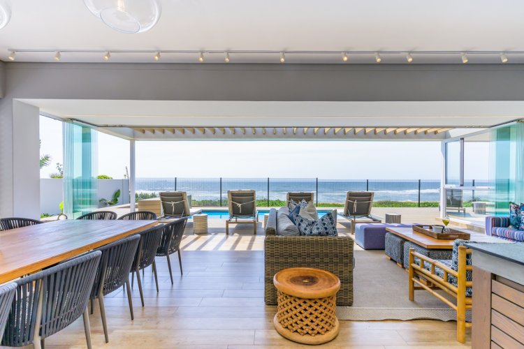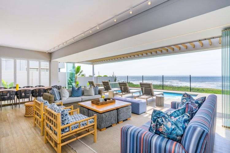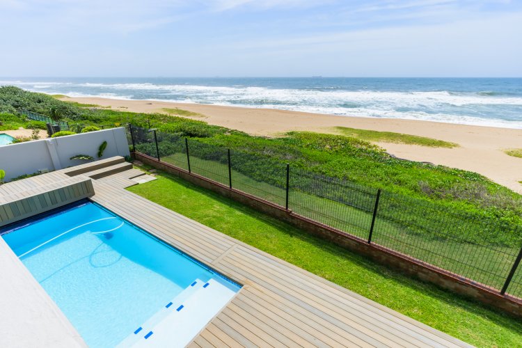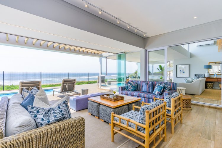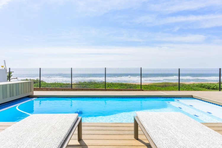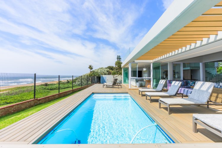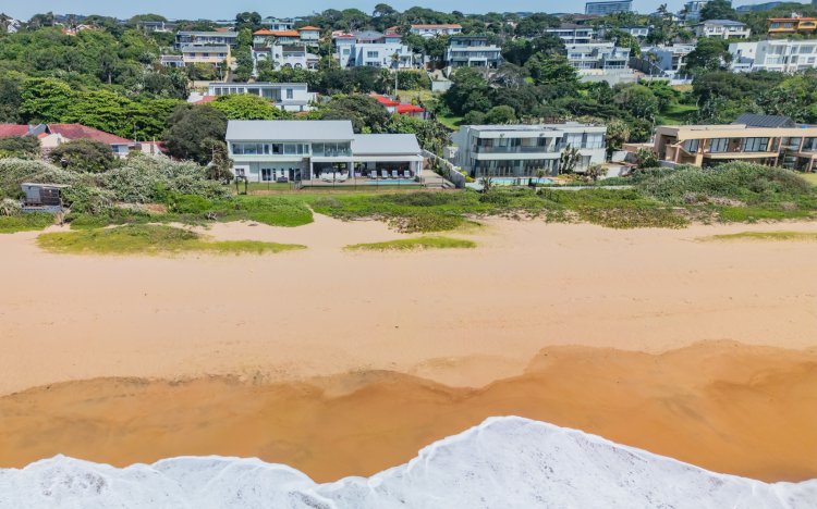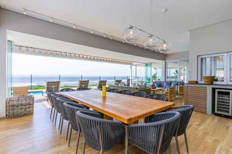 Try to catch your breath as you enter a space that simply cannot be competed with. As you arrive, discover an extraordinary, fully furnished beachfront residence where refined architectural design, uninterrupted ocean views, and effortless luxury come together in perfect harmony. This exceptional home offers an unparalleled coastal lifestyle – private, elegant, and designed for both relaxation and sophisticated entertaining. A striking double-volume glass entrance sets the tone, revealing expansive open-plan living spaces bathed in natural light and framed by sweeping sea vistas. The designer kitchen is both stylish and functional, featuring granite countertops, a gas hob, and a generously-sized, and completely separate, scullery and laundry, ideal for seamless everyday living or hosting guests. Floor-to-ceiling stacking glass doors open to a spectacular indoor–outdoor entertainment pavilion. Here, a built-in barbecue, integrated refrigeration, and an impressive 14-seater dining table create the ultimate setting for memorable gatherings. Beyond, a shimmering swimming pool with an automated, retractable cover is surrounded by luxury sun loungers and overlooks a manicured lawn that meets with the shoreline right on your doorstep. A discreet, transparent safety fence preserves uninterrupted ocean views, while an outdoor shower offers a tranquil transition from beach to home. Accommodation The residence comprises six beautifully appointed en-suite bedrooms, offering privacy and comfort for family and guests alike: • Four bedrooms on the lower level, including two sea-facing suites • A privately positioned guest suite with its own entrance • Two upstairs bedrooms with elevated, panoramic ocean views Additional living areas include a formal lounge, television lounge, guest powder room, and an elegant upstairs lounge – providing multiple spaces to relax, retreat, or entertain. Additional Features • Offered fully-furnished with bespoke designer decor • Backup generator ensuring uninterrupted power • Three large water tanks for reliable water supply • Three garages providing secure parking and storage This rare beachfront offering presents a turnkey luxury retreat – perfect as a primary residence, holiday home, or international investment. Simply arrive and immerse yourself in the timeless beauty of oceanfront living, where every day is enhanced by sea breezes, golden light, and the soothing sound of the waves.