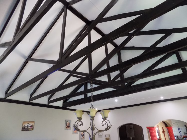 Main house: By entering the house you are greeted with tiles trough out the house. The property is very neat and well maintained 4 Bedrooms 3 Bathrooms Open plan kitchen with braai area/tv room Dining area Spacious living room with beautiful wooden beam ceiling Washing room Large swimming pool with lapa Designer garden with irrigation