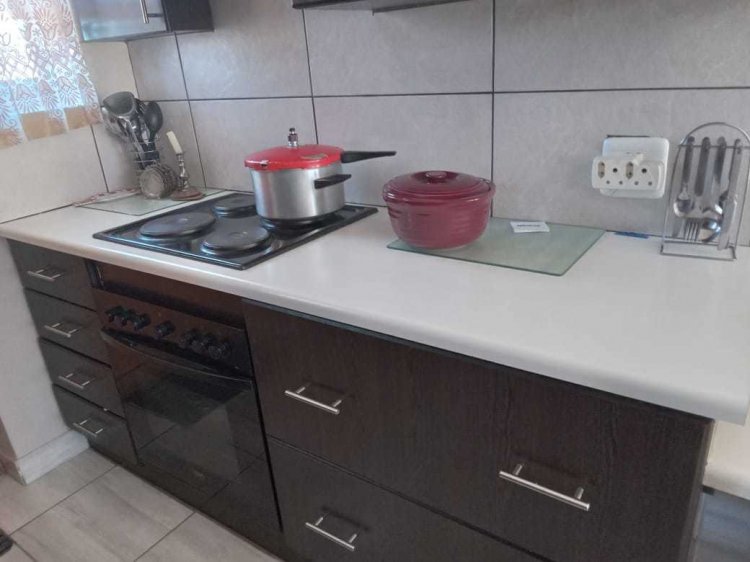 The unit offers a modern, well-designed kitchen with quality finishes, oven and hob surrounded by cupboards and a double sink with a mixer. Open plan living area.