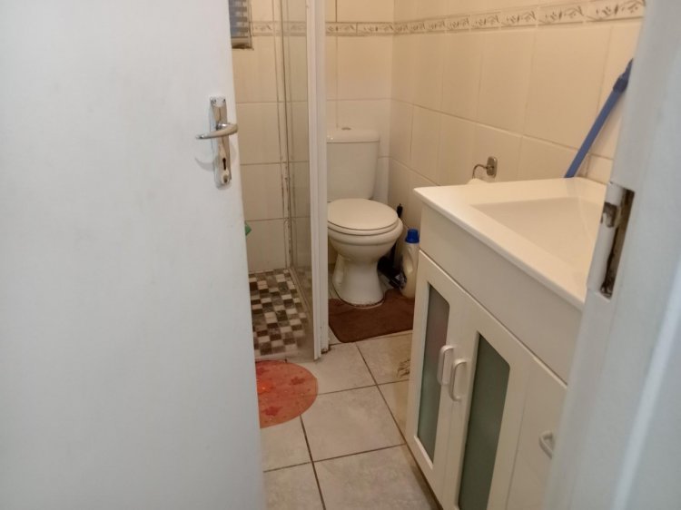 Bathroom with shower and toilet plus a bonus of built in cupboard for toiletries.