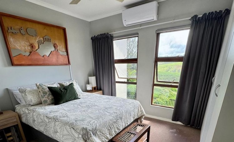 The airconditioned main bedroom overlooks the cane and the ensuite bathroom closes with a hanging barn door. The wall opposite the bed is all built in cupboards.