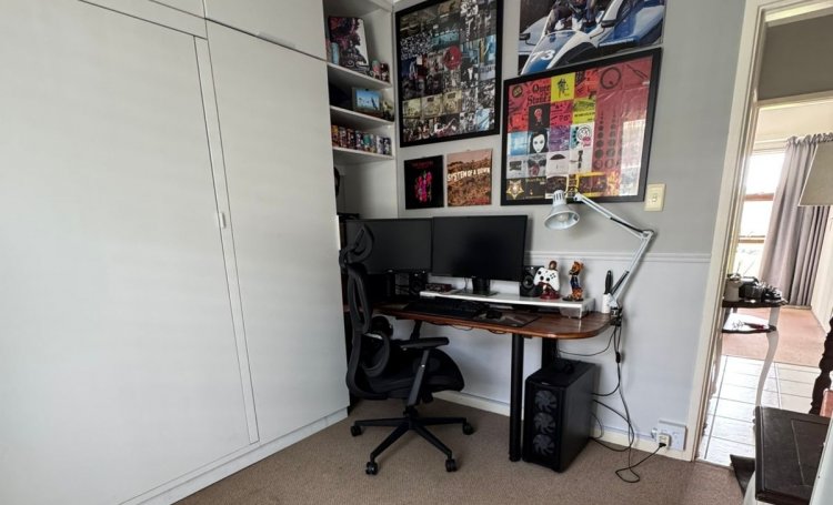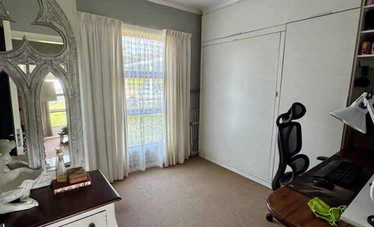 The small bedroom has been converted to a study but has a built-in double Murphy bed discretely behind the cupboard door face and additional cupboard space opposite the bed.
