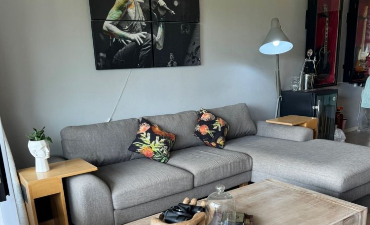 The open plan living area is airconditioned and leads onto the balcony which has recently had the railings upgraded to a fibre-Crete-composite which needs less maintenance than wood.