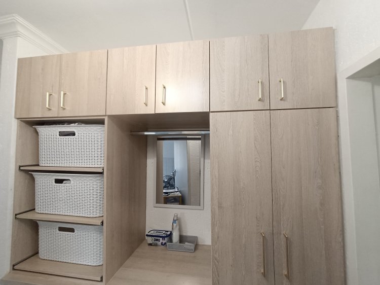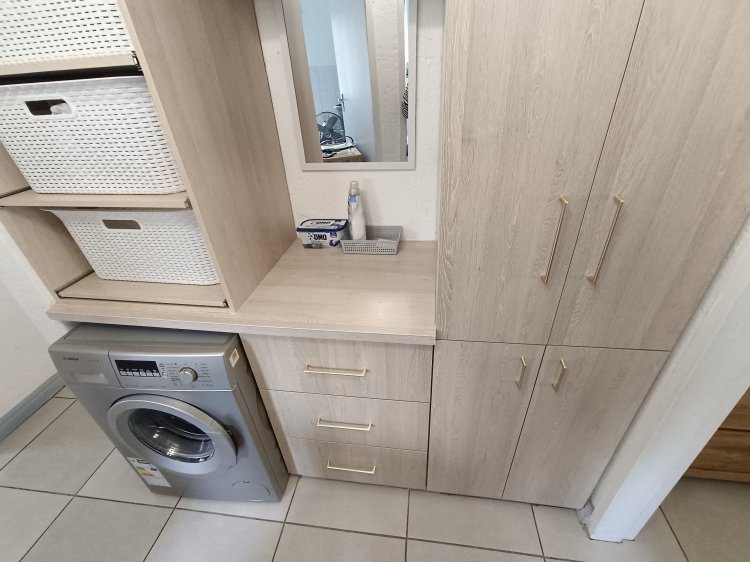 Dedicated laundry nook in the passage with space for a front-loader washing machine and beautifully designed linen cupboards