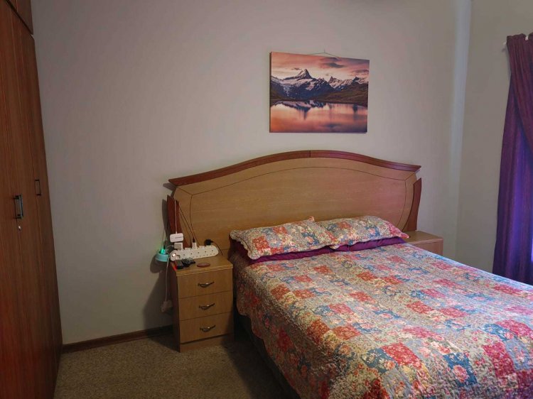 This home features two spacious, carpeted bedrooms equipped with built-in wooden closets, along with a bathroom and a convenient guest toilet. Ceiling fans are installed in the living area and both bedrooms for added comfort.