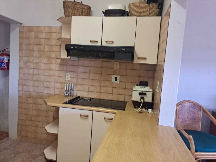 Enter the townhouse via a passageway. the front entrance opens onto a spacious living area comprising of a lounge and dining room. An attractive room with high beamed ceilings and tall windows looking out over the front garden. Natural light and space are a feature of this living area. The kitchen is just off the dining room area and has solid wood cabinets with an electric hob and ceramic sink. A spacious scullery/laundry leads off from the kitchen.
