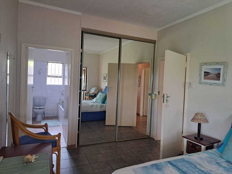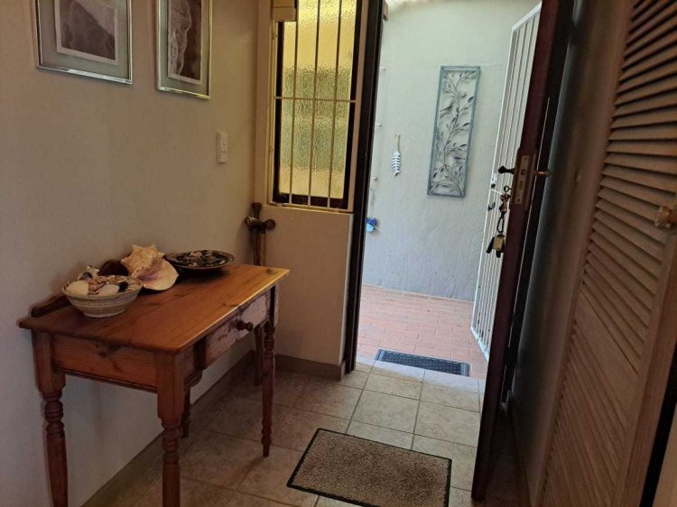 A spacious and level townhouse with some sea views, in a secure residential complex with its own borehole. A small quiet and well run residential complex, just a minutes drive from the highway. This unit is wheelchair friendly and would be ideal for a retired couple, or a family. Pet friendly – one small dog only – and opens onto a large lawned area and as well has its own private enclosed front garden with views over the town and some sea views. This is an end unit with the garage attached to the townhouse.