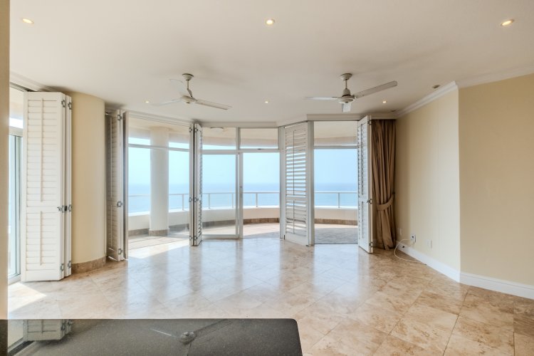 The spacious open-plan kitchen, dining, and lounge areas flow effortlessly onto a wrap-around balcony showcasing panoramic views of the Indian Ocean and the iconic Oyster Box Lighthouse. Every room captures breathtaking sea vistas, while elegant wooden shutter blinds add timeless style. Enjoy the convenience of direct lift access, secure undercover parking, manicured gardens, a sparkling pool, and an inviting braai area — all within a 24-hour secure estate.