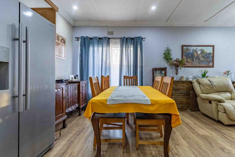 Step inside to a warm and inviting living area featuring a lounge with laminated flooring, an open-plan tiled dining room, a wood-burning fireplace to keep the home cosy in winter.