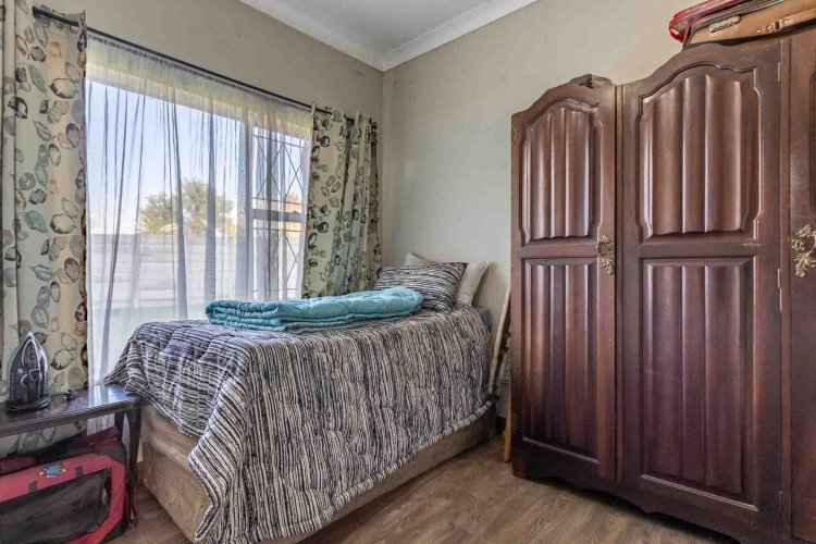 The tiled kitchen includes a 4-plate stove, extractor fan, pantry, space for 1 undercounter appliance, and provision for an oven. A laminated passage leads to three spacious bedrooms — Bedrooms 1 & 2 are tiled with built-in cupboards, while Bedroom 3 offers laminated flooring and BICs.