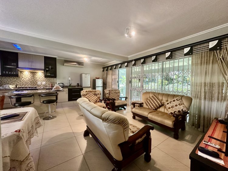 The air-conditioned living area opens onto a covered patio with a built-in braai, overlooking a private pet-friendly garden, perfect for chilling out or enjoying a weekend braai.