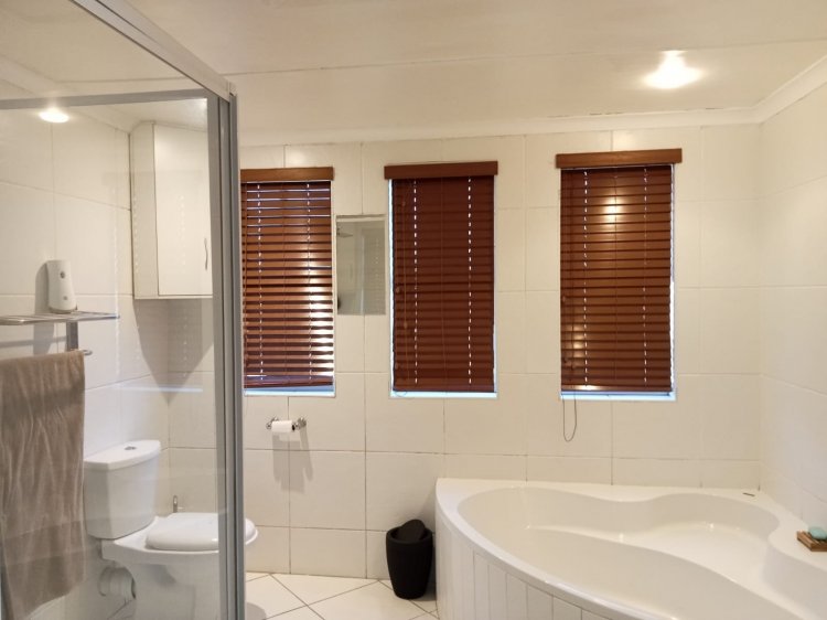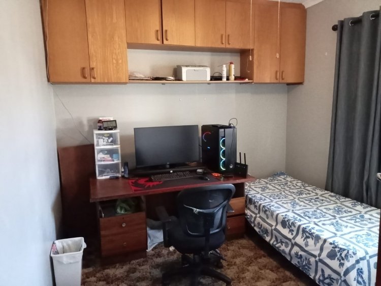 The modern kitchen is fitted with a gas stove and electric oven, offering functionality and style. The home features 3 well-sized bedrooms, all fitted with built-in cupboards and ceiling fans, along with 2,5 bathrooms, including a private en-suite in the main bedroom. Additional features include a separate laundry, an outdoor braai and entertainment area, a double garage, single carport, and a separate wendy house for storage or extra utility space.