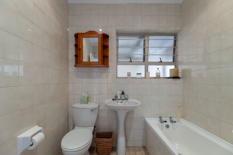 The master suite offers generous built-in cupboards and an en-suite bathroom with a shower, while two additional sunny bedrooms share a family bathroom with a bathtub.