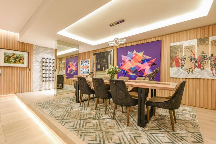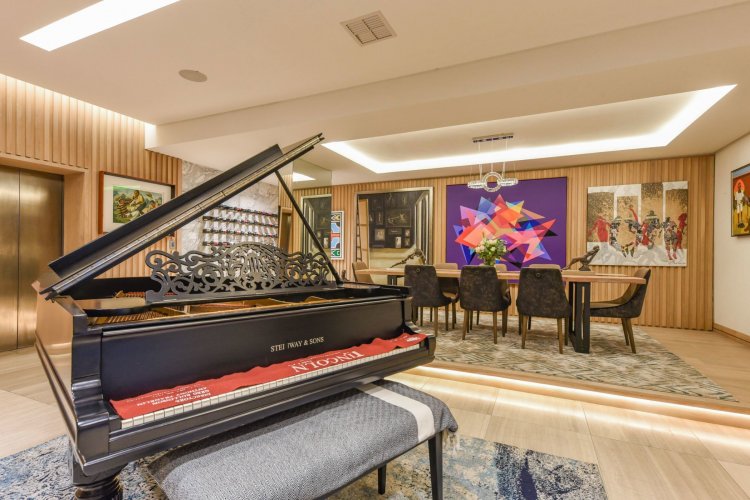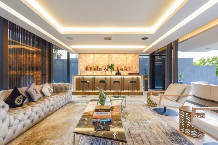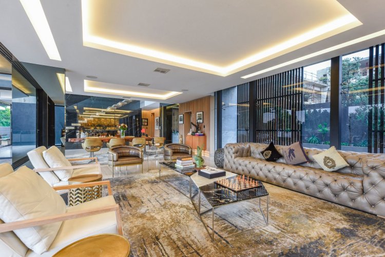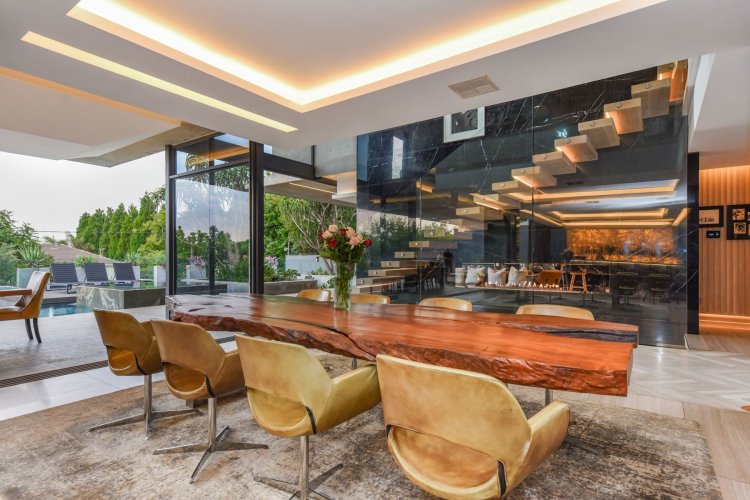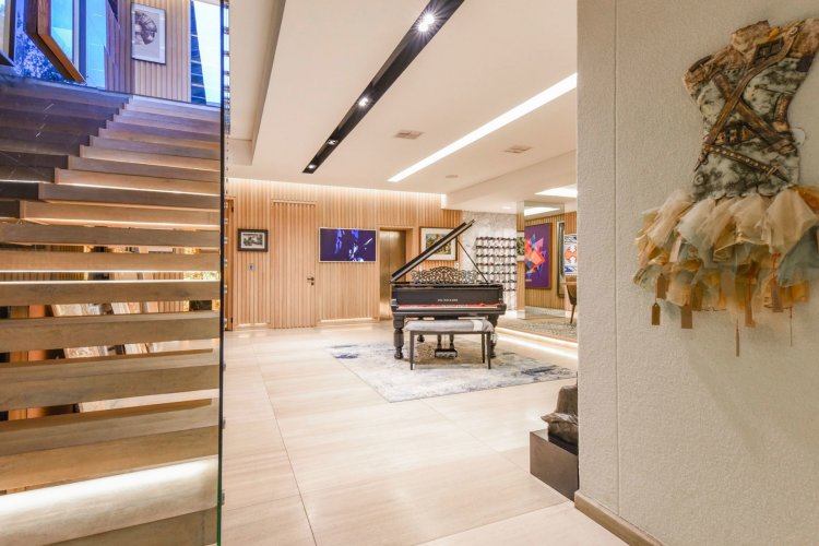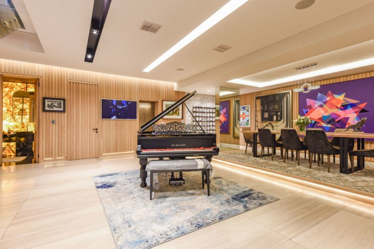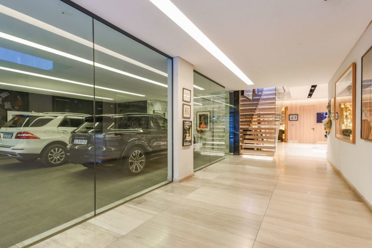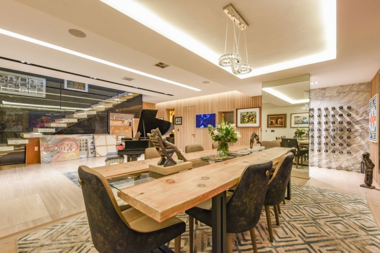 Completing this remarkable residence is the basement level, featuring a glass-enclosed showroom garage that doubles as a bold design statement. An additional entertainment lounge and dining area extend from this space, ideal for hosting lavish gatherings, supported by a second guest cloakroom.