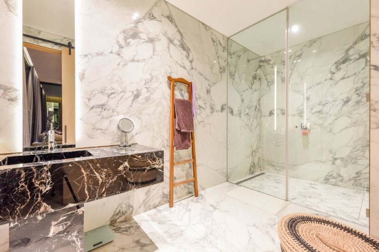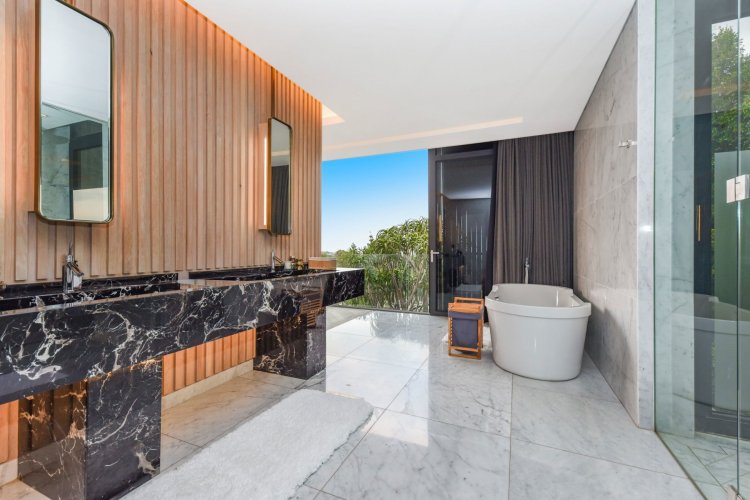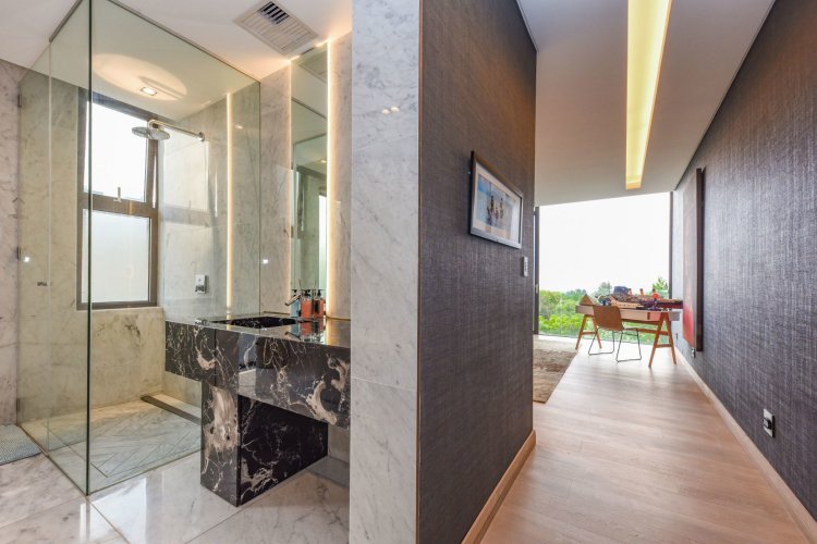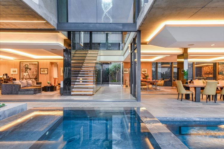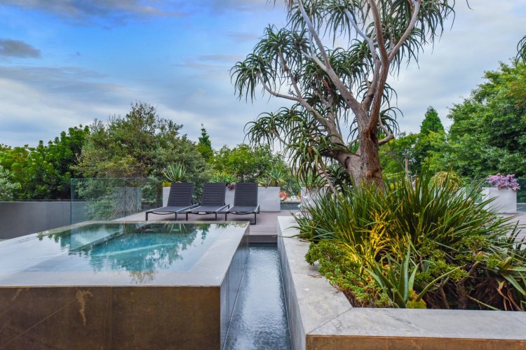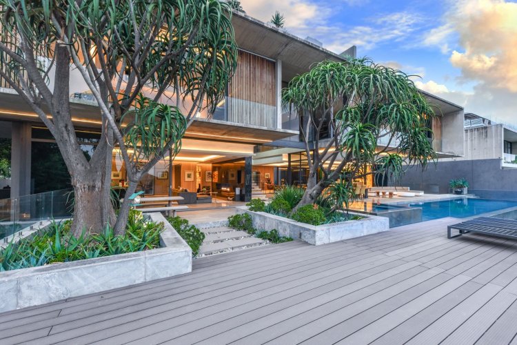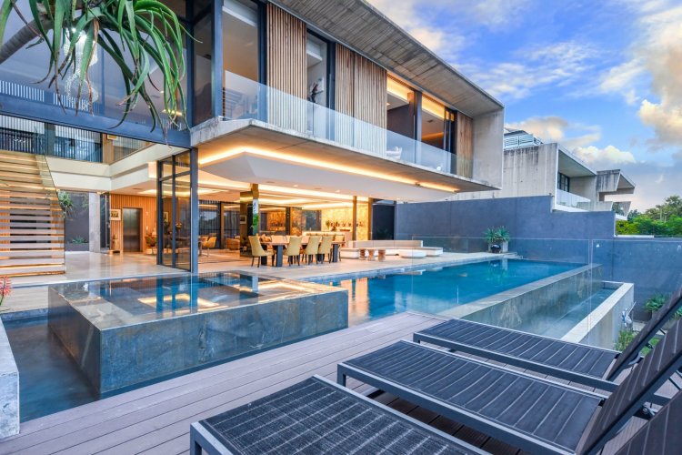 All reception areas open via tinted stacking doors onto the covered patio, creating seamless indoor-outdoor living. The patio extends to a wooden deck with a 20-metre heated infinity pool and jacuzzi overlooking the landscaped garden, evoking the ambience of a private luxury resort. A guest cloakroom conveniently serves this level.