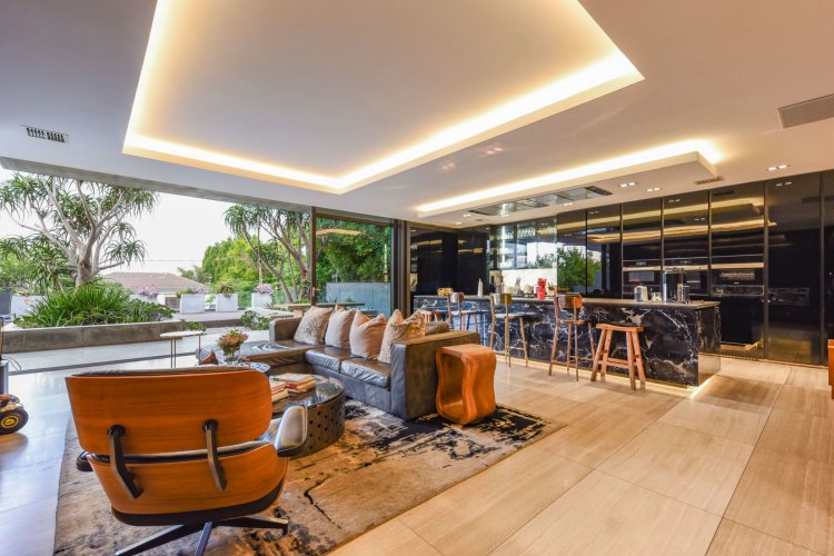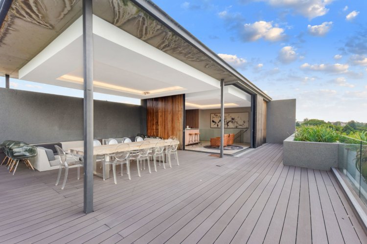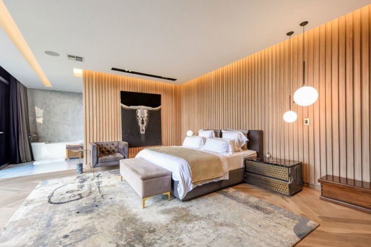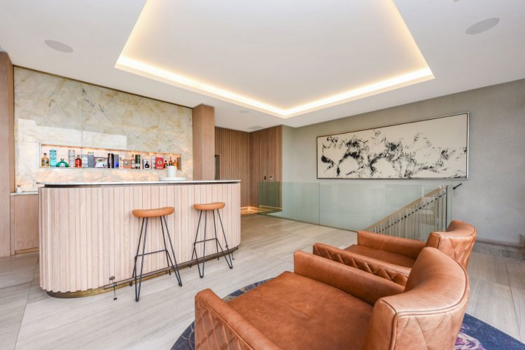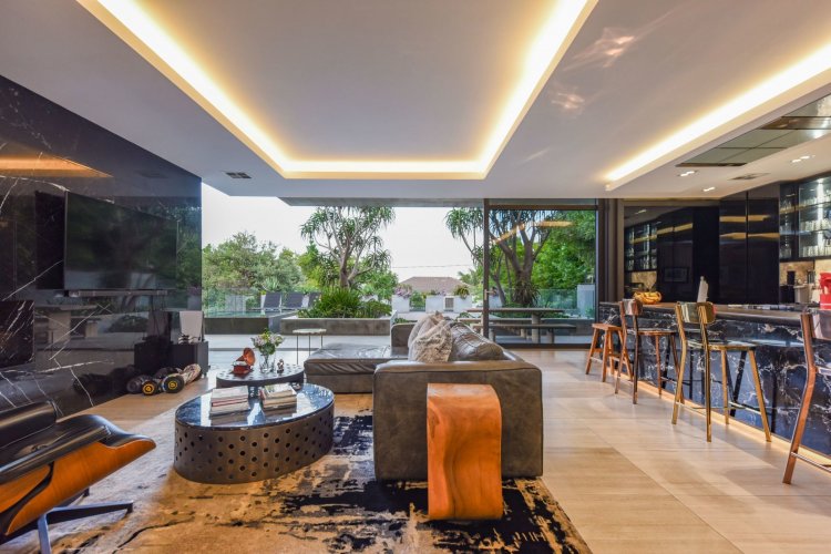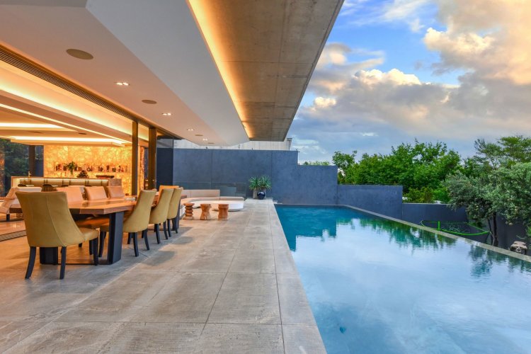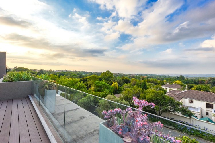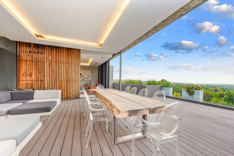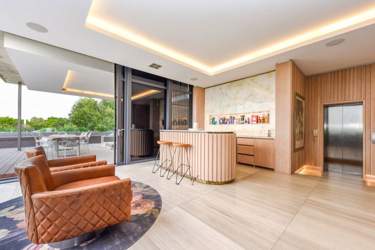 The third level is dedicated to elevated entertaining, accessed via elegant wood-panelled stairs. A built-in bar opens onto a private rooftop terrace, offering an extraordinary space to host guests while enjoying uninterrupted, panoramic views of sweeping green vistas and the natural beauty South Africa is celebrated for.