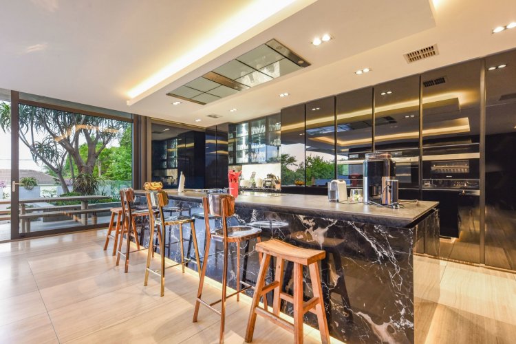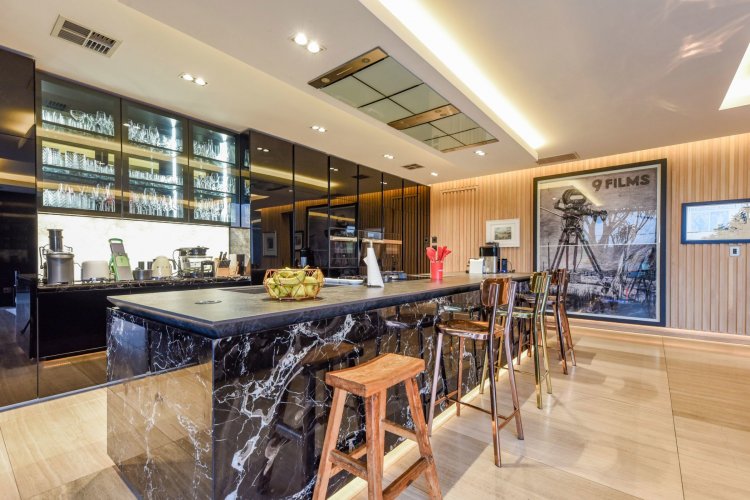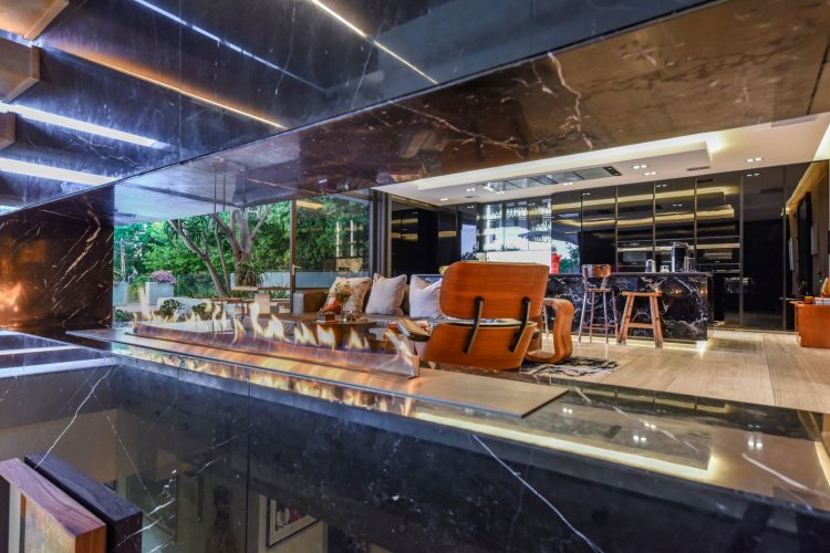 A light-filled double-volume entrance hall sets the tone for the exceptional interiors beyond. Each reception space has been meticulously custom designed, resulting in a home that is entirely unique. To the left, the formal lounge with a built-in bar flows into the elegant dining room. To the right, the family TV lounge, anchored by a gas-burning fireplace, transitions into the showpiece kitchen. This wall-to-wall culinary space features stone and marble countertops, a centre island, gas and electric hobs, eye-level oven, microwave, warmer and extractor fan, all set against a dramatic onyx feature wall. Premium Miele appliances and a discreet scullery with concealed pantry and space for three appliances complete the kitchen.