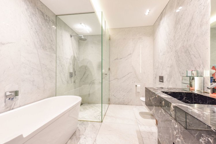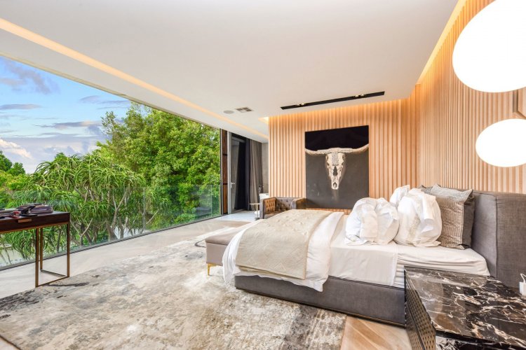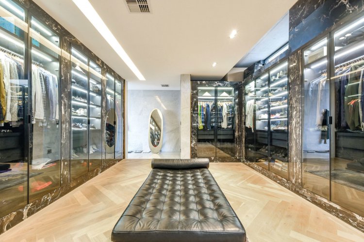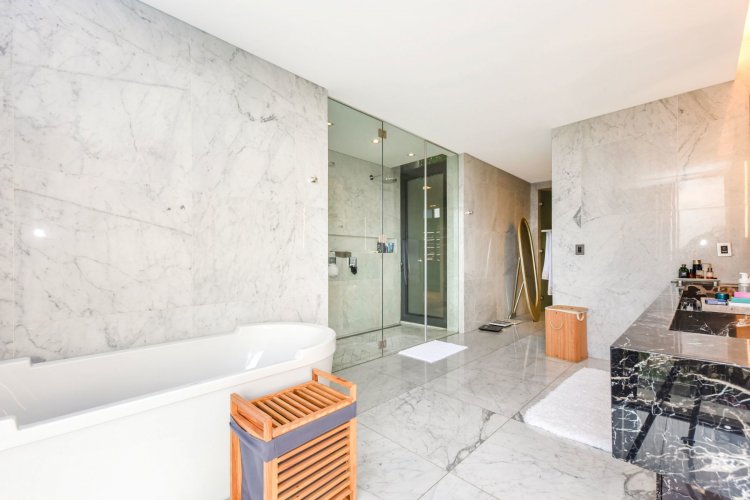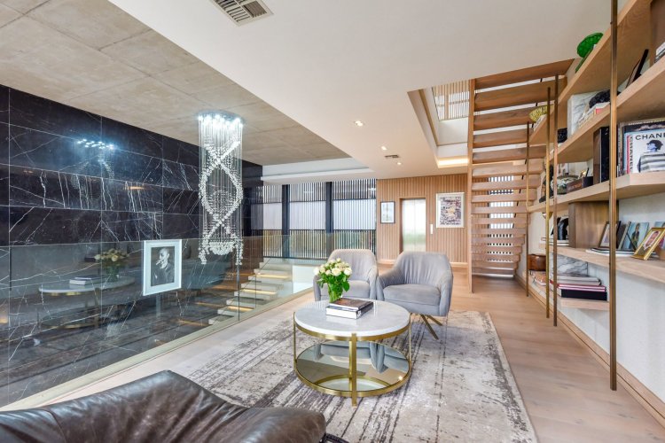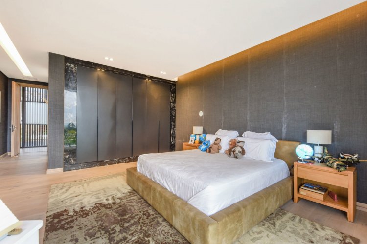 The glass-panelled floating staircase leads to the second floor, where a pyjama lounge connects three en suite bedrooms. The master suite offers a his-and-hers dressing room, a full en suite bathroom and a private Juliet balcony that frames tranquil northerly views over greenery and the entertainer's garden below.