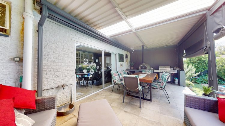 Designed for relaxed living and entertaining, the home boasts a sunroom/entertainment area flowing out to a private covered patio with a built-in pizza oven — perfect for hosting friends and family. Overlooking the patio is a beautifully landscaped garden with a medium-sized swimming pool and space for a pool table, making this home an entertainer’s haven.