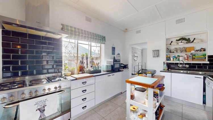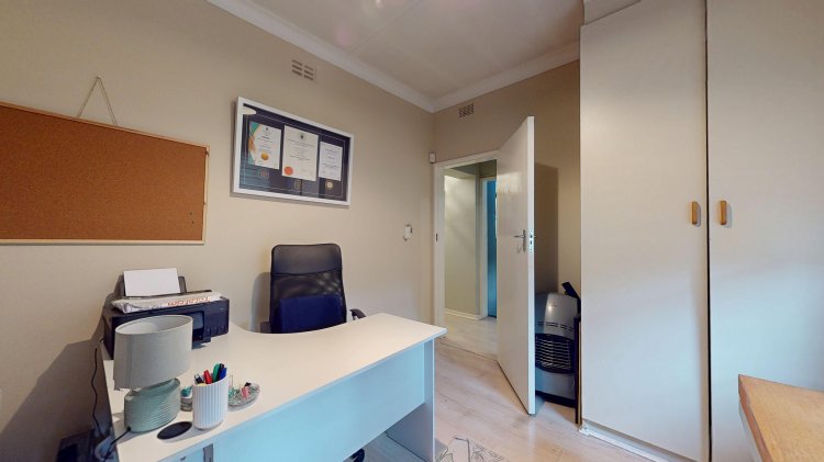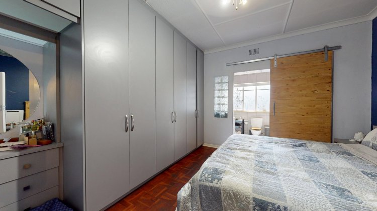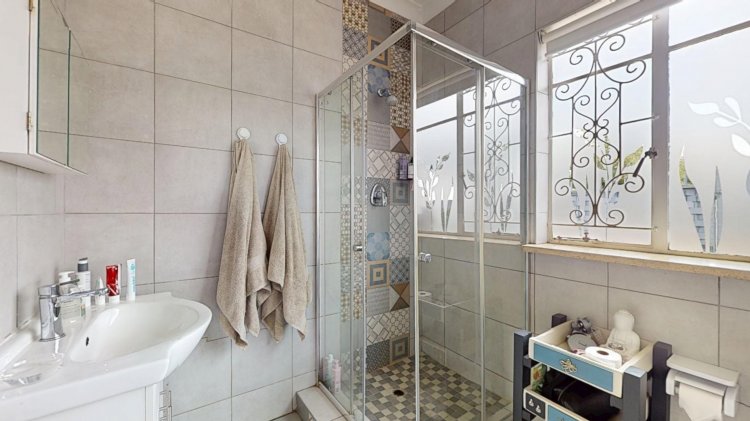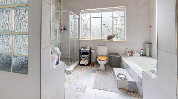 Down the passage, you’ll find three well-sized bedrooms, all with built-in cupboards. The main bedroom features an en-suite bathroom, while the home also offers a full family bathroom (bath, shower, basin, and toilet) plus an additional guest toilet for convenience.