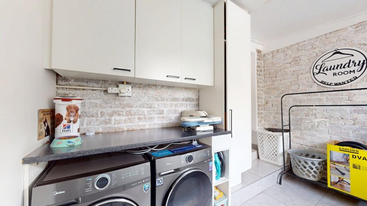 The dining area opens seamlessly into an ultra-modern kitchen fitted with a gas stove, space for a double-door fridge, and a dishwasher, complemented by a separate scullery/laundry with room for both a washing machine and dryer.
