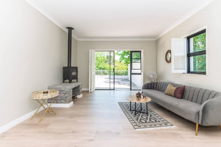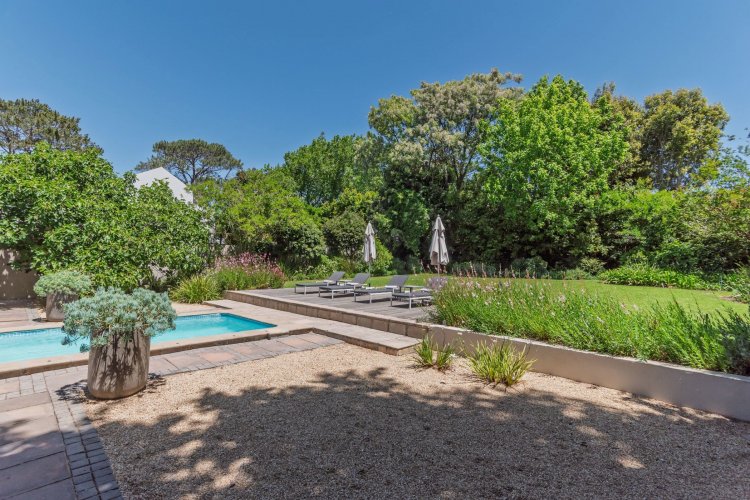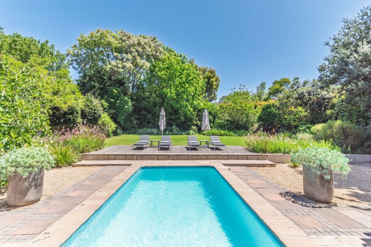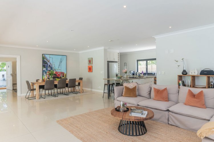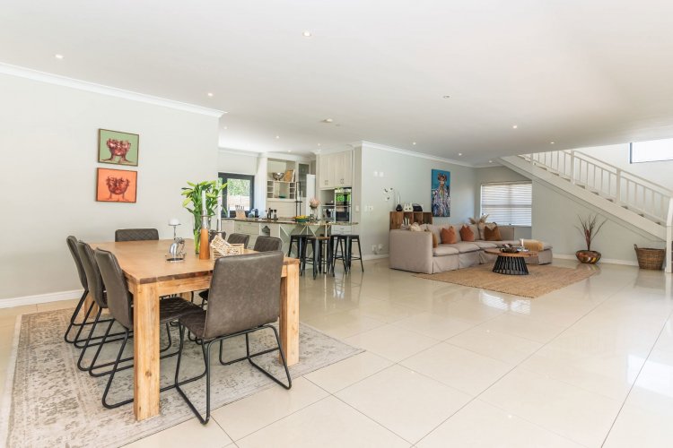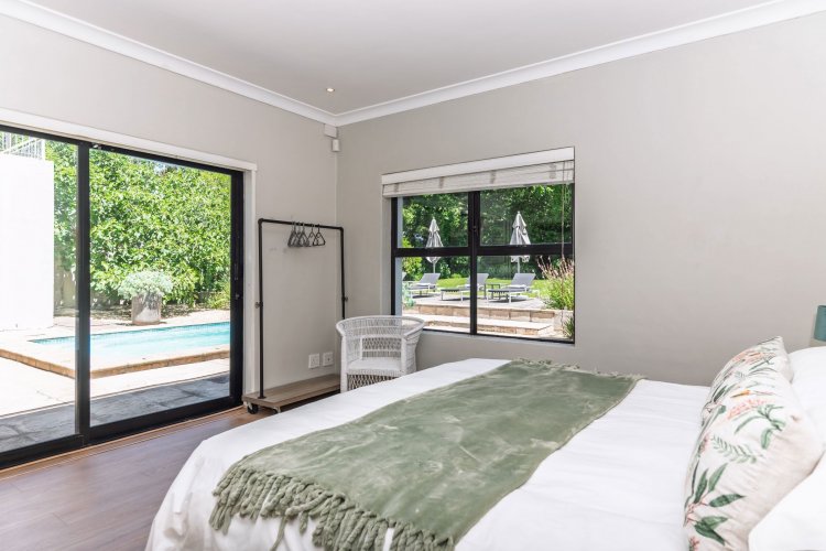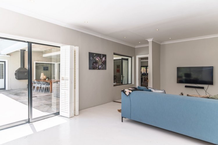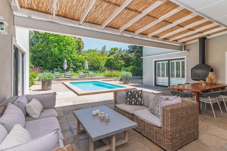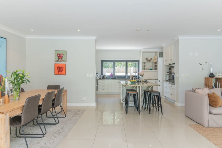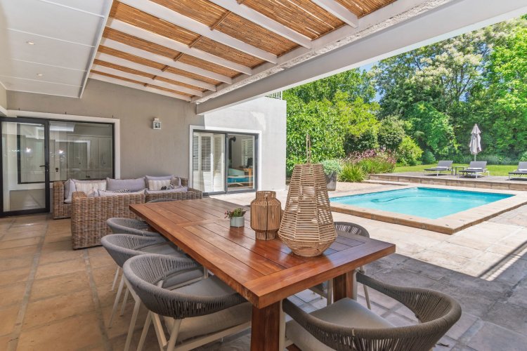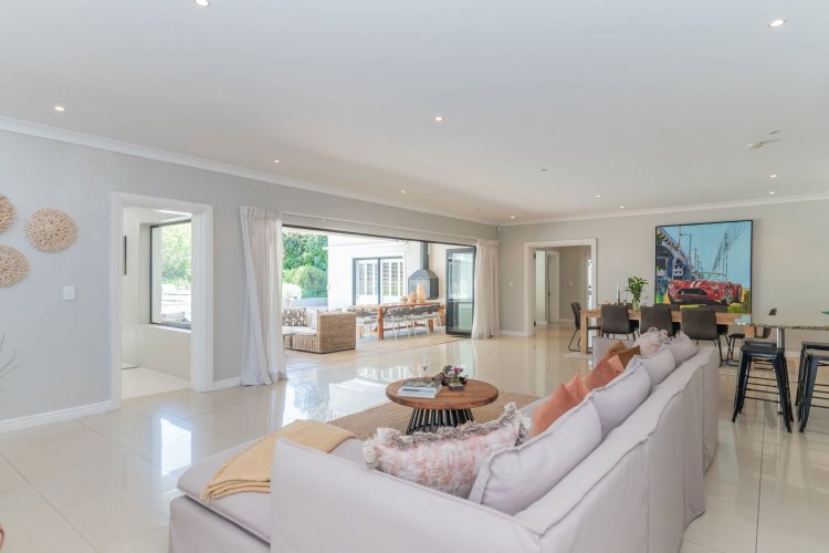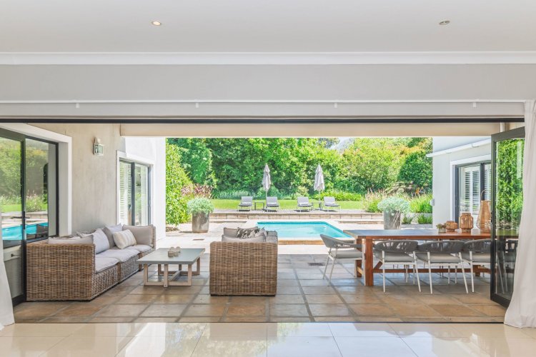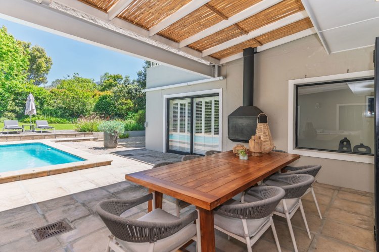 This beautifully styled north-facing home offers seamless, contemporary living in a peaceful cul-de-sac setting. The open-plan kitchen flows effortlessly into a generous reception ares, combining lounge and dining spaces that open through fold-back doors onto a covered pool terrace. Expansive picture windows flood the interiors with natural light while framing the lush garden and surrounding greenery, complemented by elegant American shutters for privacy. The fireplaces create a warm and inviting atmosphere during the cooler months.
