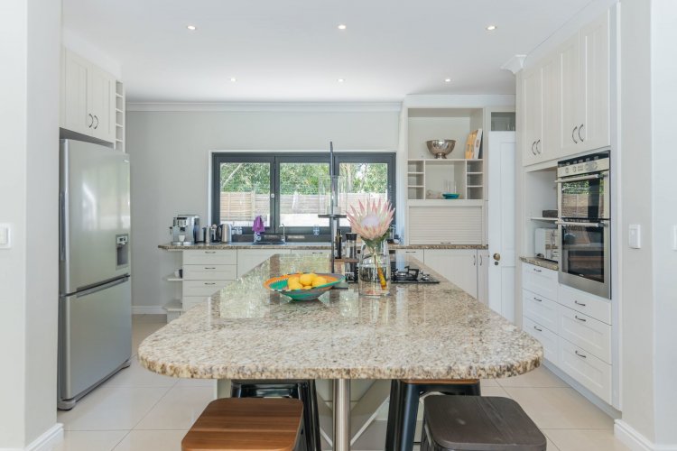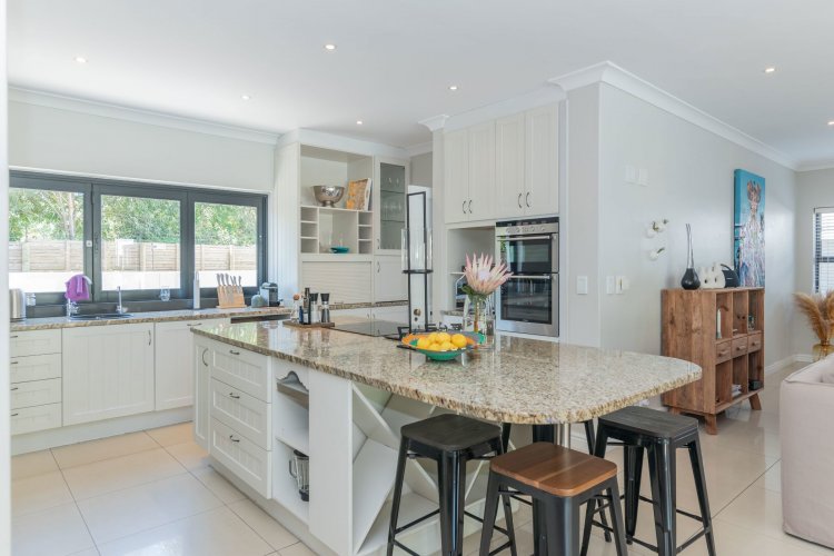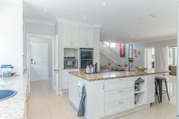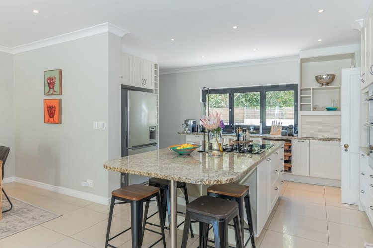 The well-appointed kitchen features a central island with seating, granite countertops, Siemens ceramic and gas hob. In addition, there is a double Siemens oven, and a convenient prep bowl. A walk-in pantry provides ample storage, while the separate laundry and scullery area includes a double stainless-steel sink and space for 3 appliances.
