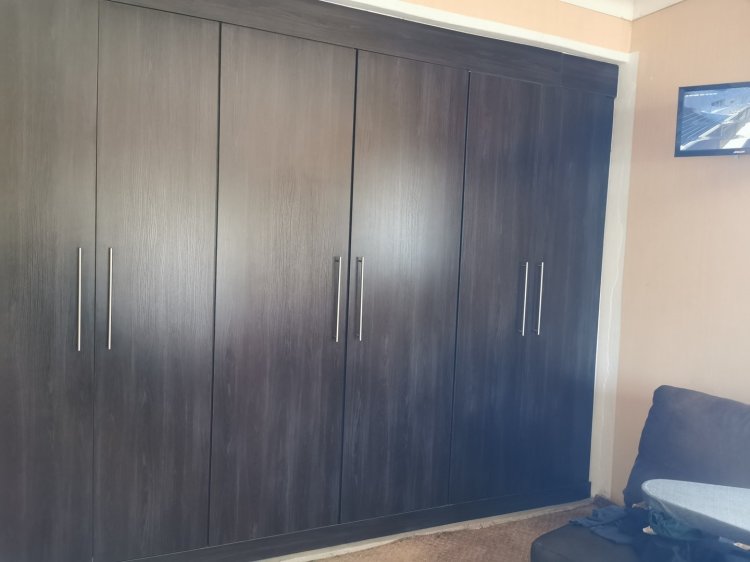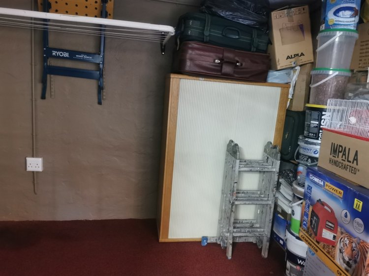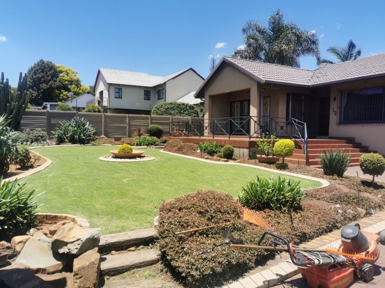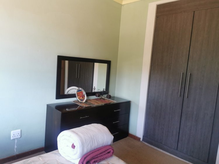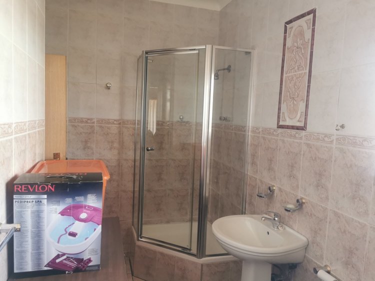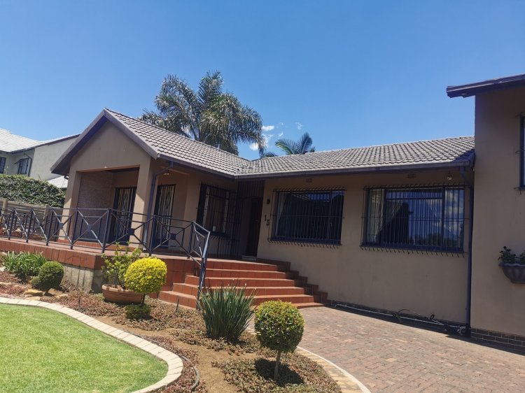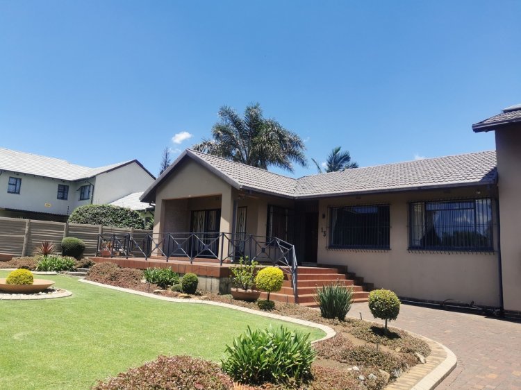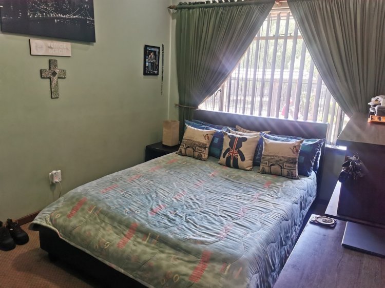 The home features three spacious, carpeted bedrooms with built-in cupboards, serviced by a bathroom and a separate guest toilet. The master bedroom is privately positioned above the garages and is generously sized, offering loads of built-in cupboards and plush carpeting. The en-suite bathroom is impressively spacious.