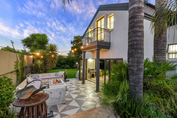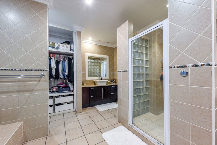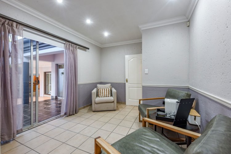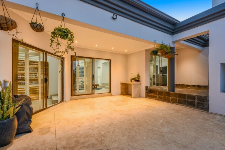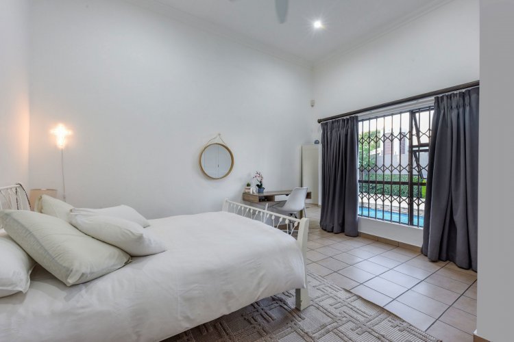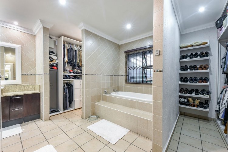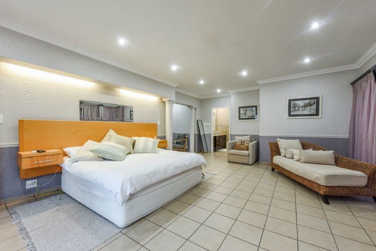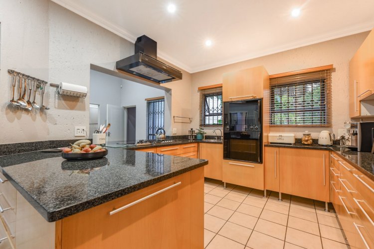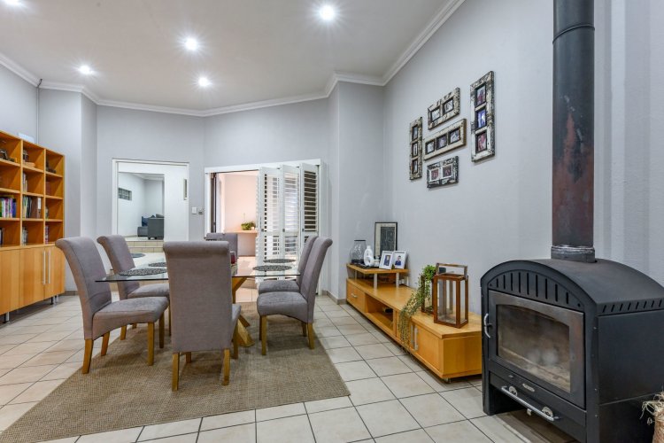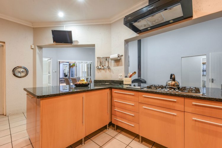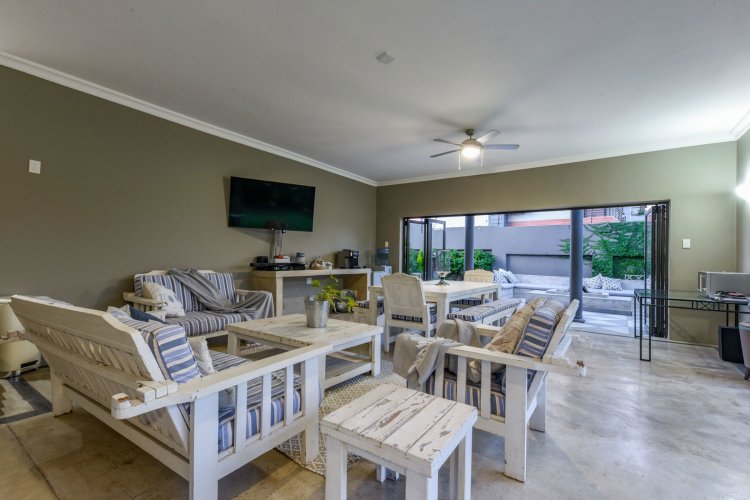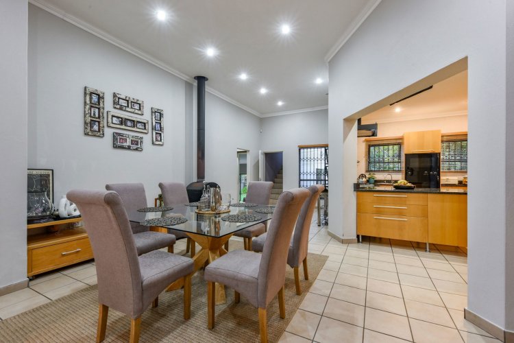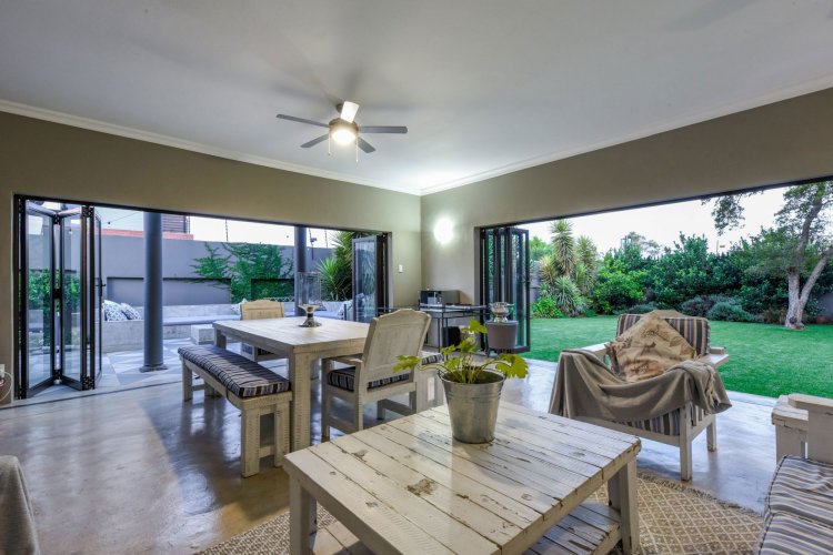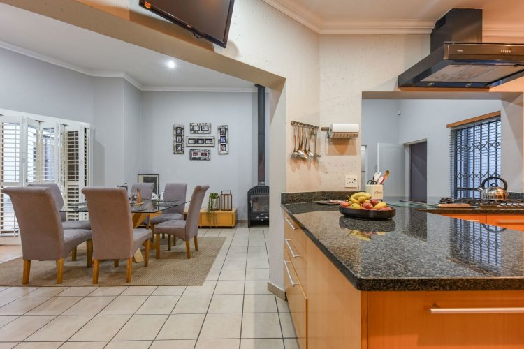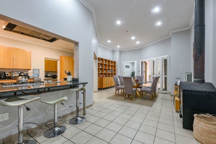 The open-plan kitchen and dining room is a culinary haven, where gourmet meals can be prepared with ease amidst ample built-in cupboards, granite countertops, and space for a double door fridge. The adjacent scullery offers additional storage and space for under-counter appliances, making meal prep a breeze. Entertaining is effortless in the generous entertainment room, where sleek stacking doors open out to the garden, creating the perfect flow for gatherings. The adjacent boma fire section adds warmth and ambiance, making it an ideal spot to create lasting memories with loved ones. Additionally, there's a guest loo by the entertainment room.