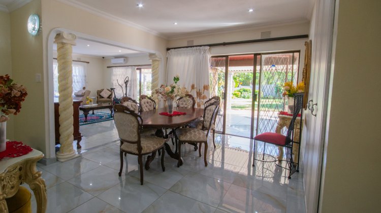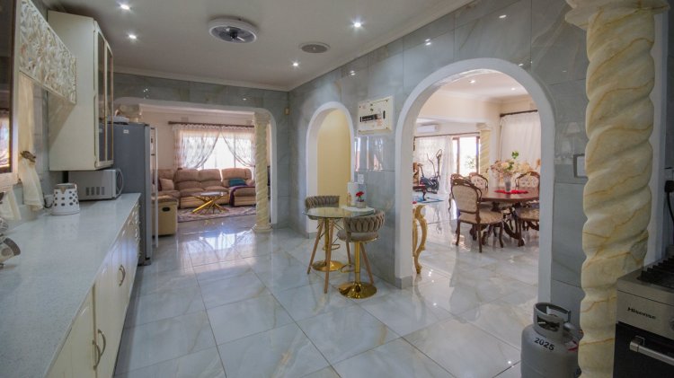 Security and comfort go hand in hand, with a full alarm system, external beams, and security cameras and electric fence offering complete peace of mind. The outdoors is equally impressive, featuring a large sparkling pool, a beautifully landscaped garden (with a section fitted with a sprinkler system), a JoJo water tank, and a separate storage room.
