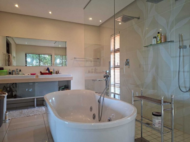 Downstairs also includes a guest bedroom with an en-suite bathroom, a guest toilet, and a cozy TV lounge. Upstairs, the impressive master suite features generous cupboard space and a striking en-suite bathroom, accompanied by two additional bedrooms and an open balcony.