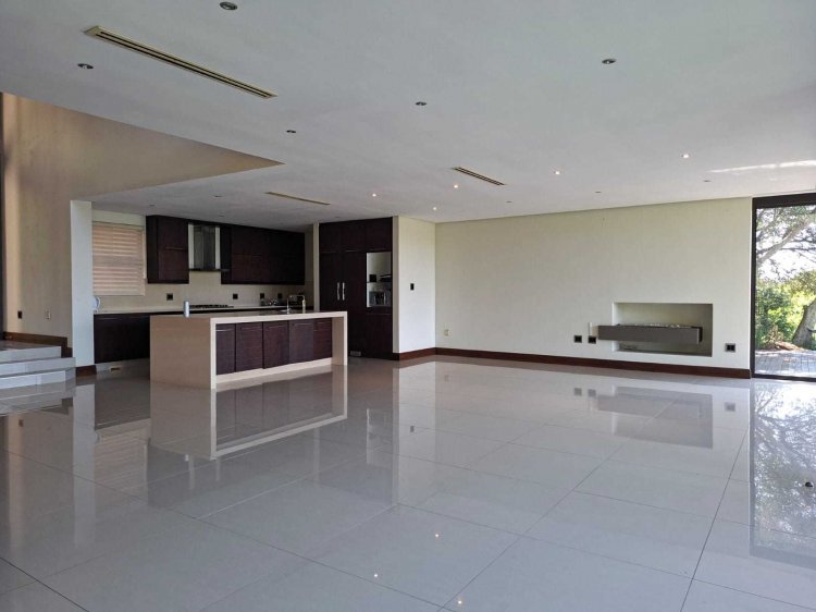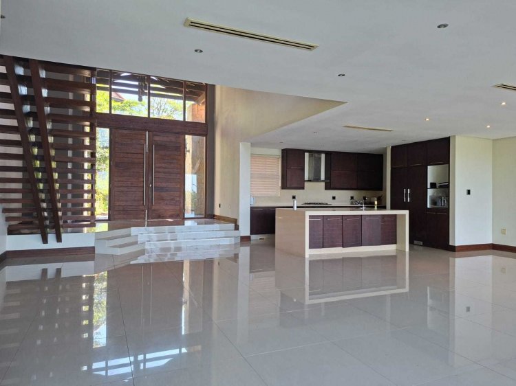 The home welcomes you with a double-volume entrance hall leading into an expansive open-plan living area that flows effortlessly through seamless glass doors onto a partially covered patio with a swimming pool — ideal for relaxed outdoor living and entertaining. The modern kitchen, complete with a separate scullery, is designed for both style and practicality.