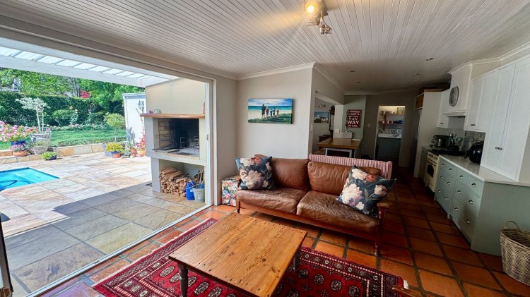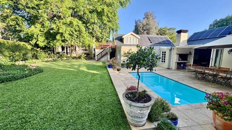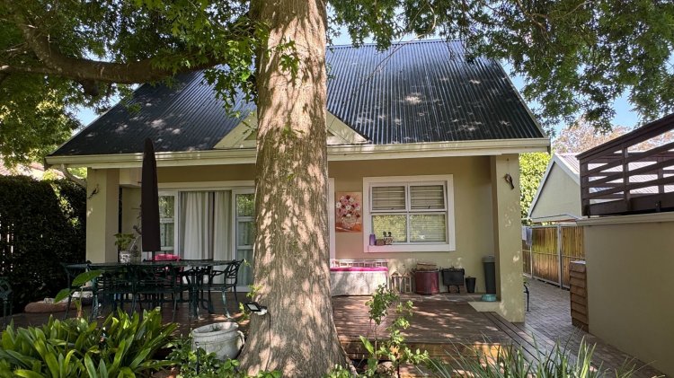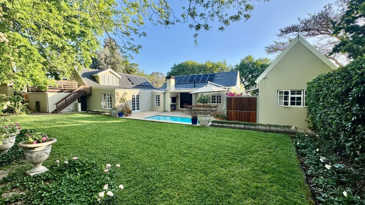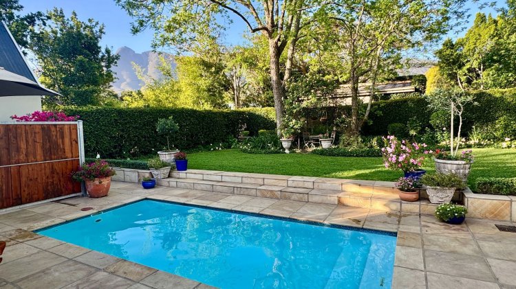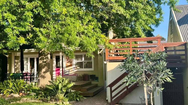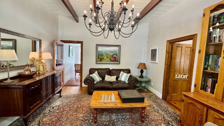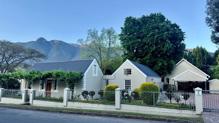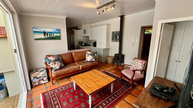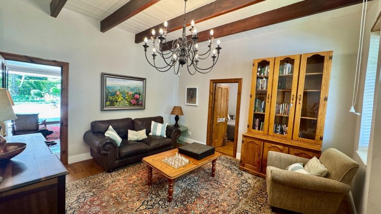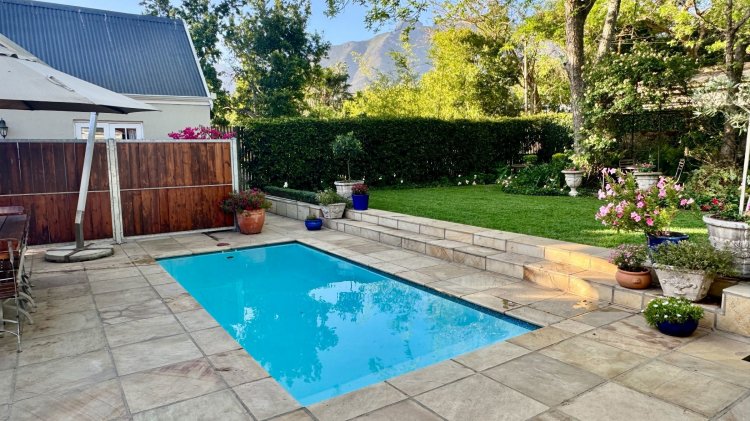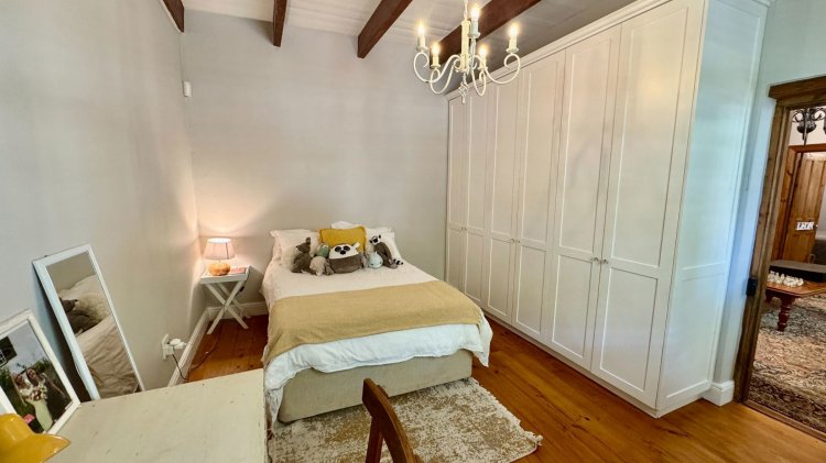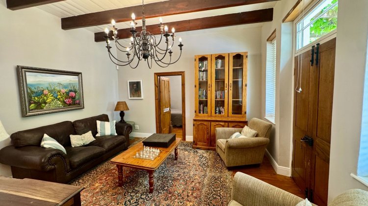 Discover this beautiful character home in the highly sought-after area of Swellendam. This family residence boasts tasteful décor throughout. The heart of the home features open-plan living areas that seamlessly connect the spacious main lounge, living room, kitchen, dining area, and home office. Stacking doors open onto an undercover patio with a built-in braai, ideal for indoor-outdoor entertaining, all overlooking a stunning garden with mature trees and a sparkling pool. Additionally, there is a charming one-bedroom garden cottage for guests, with a front stoep nestled under cascading trees, fully equipped for independent living. The property includes a double garage with a double covered port, ample off-street parking space. Above the garage is a versatile loft guest room en-suite, perfect for a workspace or hobby area. The home showcases wooden floors, doors, and windows, with later additions featuring terracotta tiles and screed floors. The Erf spans 1,125m², with a total building size of approximately 365m².