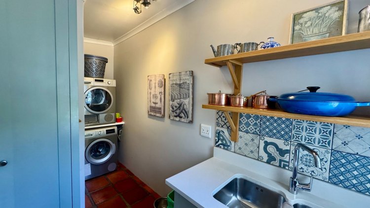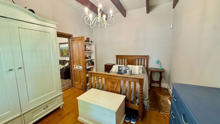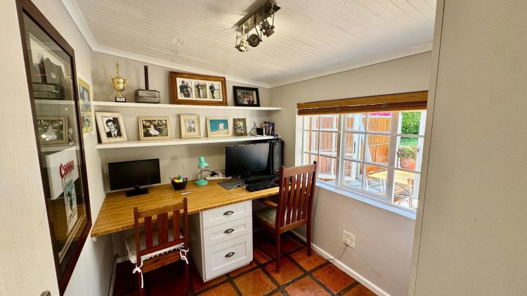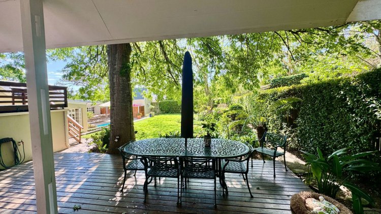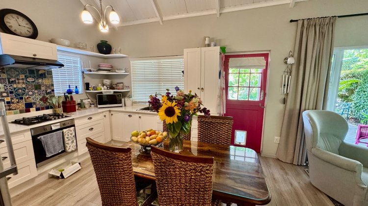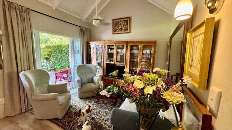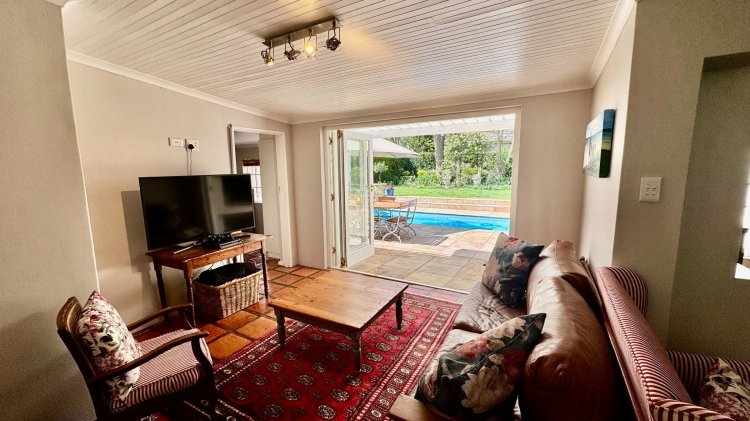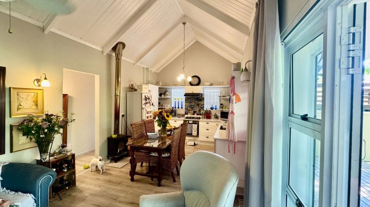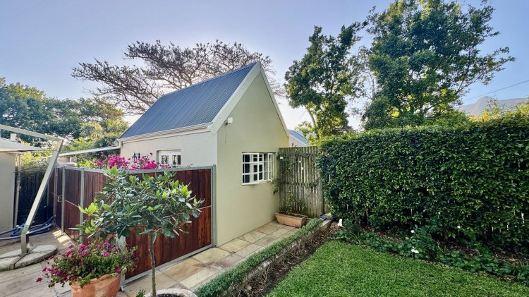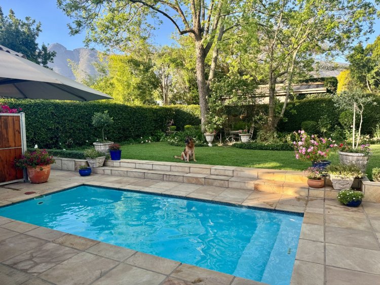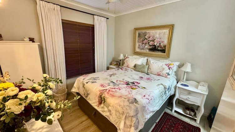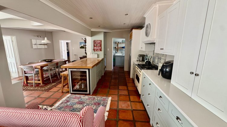Discover this beautiful character home in the highly sought-after area of Swellendam. This family residence boasts tasteful décor throughout. The heart of the home features open-plan living areas that seamlessly connect the spacious main lounge, living room, kitchen, dining area, and home office. Stacking doors open onto an undercover patio with a built-in braai, ideal for indoor-outdoor entertaining, all overlooking a stunning garden with mature trees and a sparkling pool. Additionally, there is a charming one-bedroom garden cottage for guests, with a front stoep nestled under cascading trees, fully equipped for independent living. The property includes a double garage with a double covered port, ample off-street parking space. Above the garage is a versatile loft guest room en-suite, perfect for a workspace or hobby area. The home showcases wooden floors, doors, and windows, with later additions featuring terracotta tiles and screed floors. The Erf spans 1,125m², with a total building size of approximately 365m².