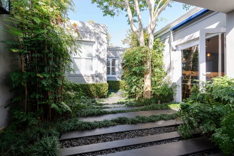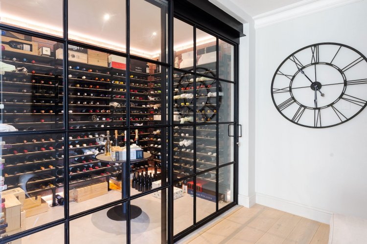 Downstairs, you'll find a temperature-controlled, glass-enclosed wine cellar, a storage room, and a guest bedroom with en-suite shower and private patio.