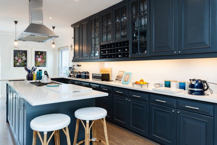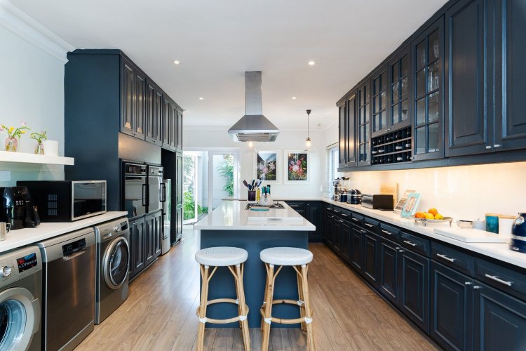 The contemporary kitchen is both functional and stylish, featuring a central island, breakfast nook, Smeg hob with extractor, and double eye-level ovens. A guest loo is also located on the ground floor.