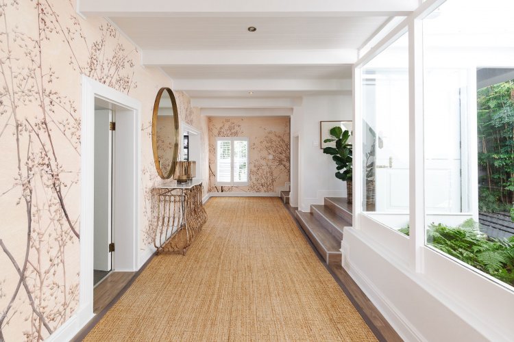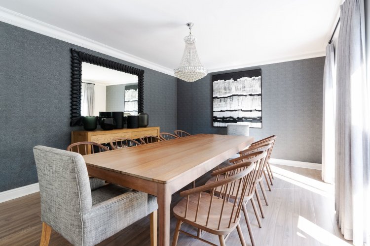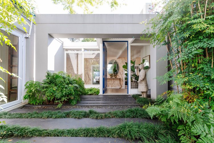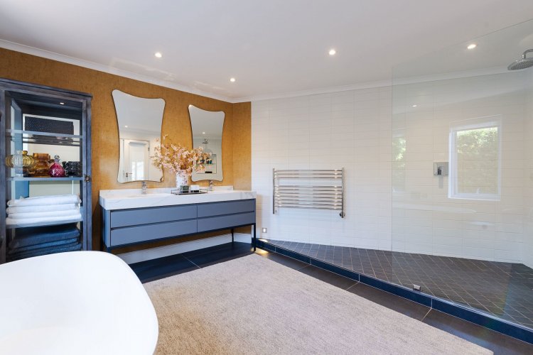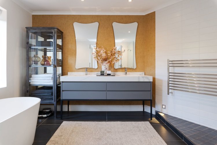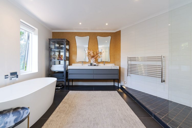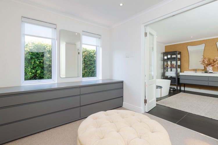 A beautifully landscaped entrance, with flourishing greenery and a tranquil water feature, sets the tone for the home's stylish interiors. A refined palette of greys, whites and silvers is enhanced by bespoke feature wallpaper, aluminium sash windows, American shutters, and a mix of high-end laminate, Oggi wood flooring, and soft carpeting throughout.