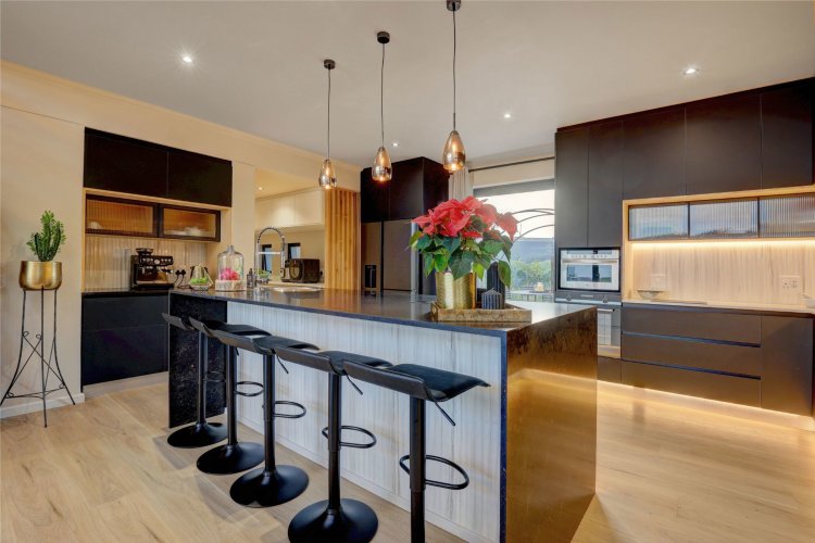 At the heart of the home is a stylish, fully equipped kitchen featuring top-of-the-line appliances, custom cabinetry with soft-touch finishes, multiple preparation areas, and a striking central island enhanced by subtle lighting.