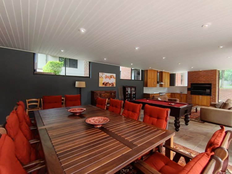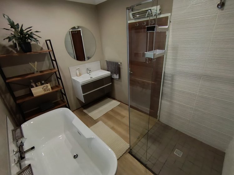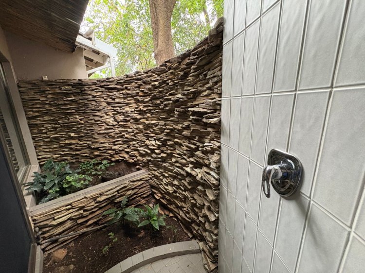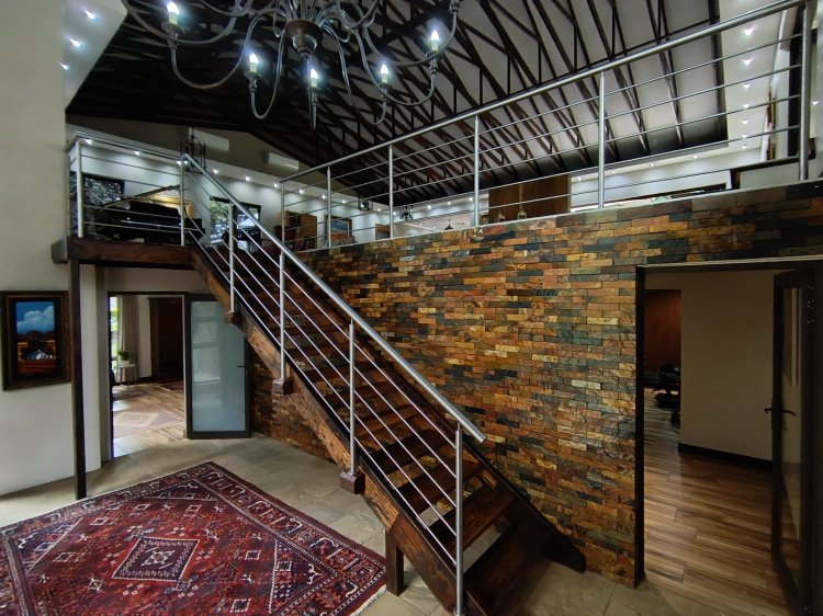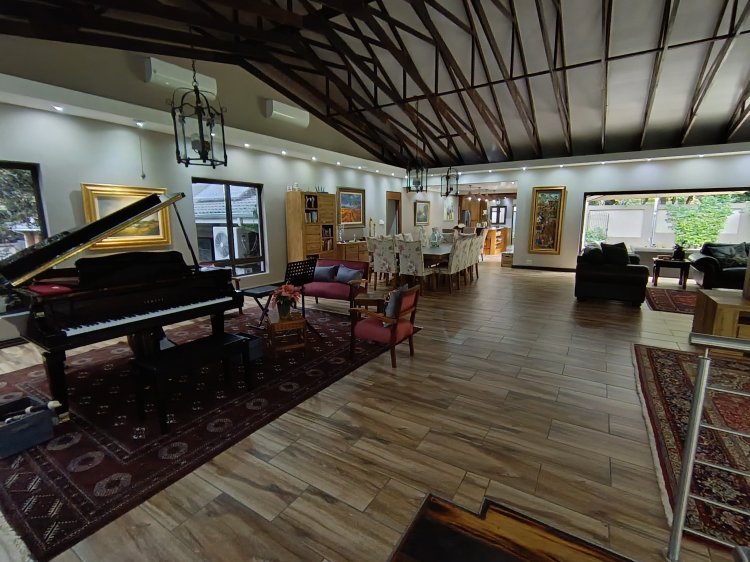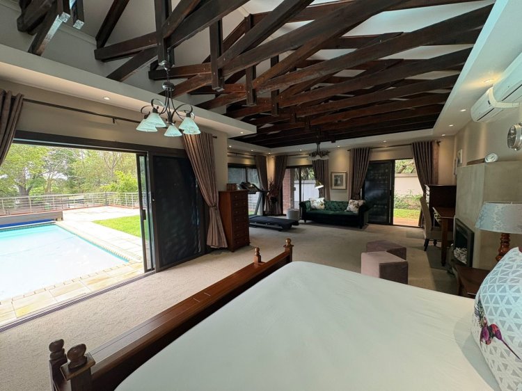 • 6 Spacious Bedrooms plus a private study and 5 stylish bathrooms. • The main suite is a royal retreat, featuring an opulent en-suite bathroom, outdoor shower, walk-in cupboards , and a relaxing lounge area with a gas fireplace and doors opening onto the sparkling heated pool. • A designer kitchen with separate laundry and scullery, offering ample cabinetry and workspace for effortless entertaining. • Expansive entertainment area complete with a built-in braai, bar, and open-plan kitchen, lounge/dining space — with stack doors that flow out to the tennis court and manicured gardens. • Beautifully landscaped garden designed for tranquility and outdoor enjoyment. • Domestic accommodation includes a bedroom, bathroom, and compact kitchen for convenience. • Four automated garages providing secure and ample parking.