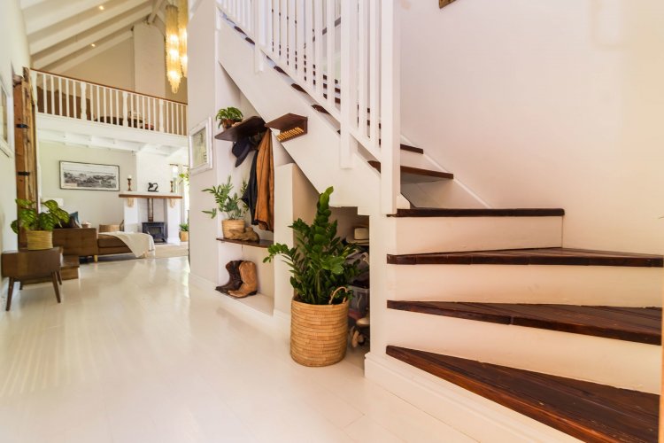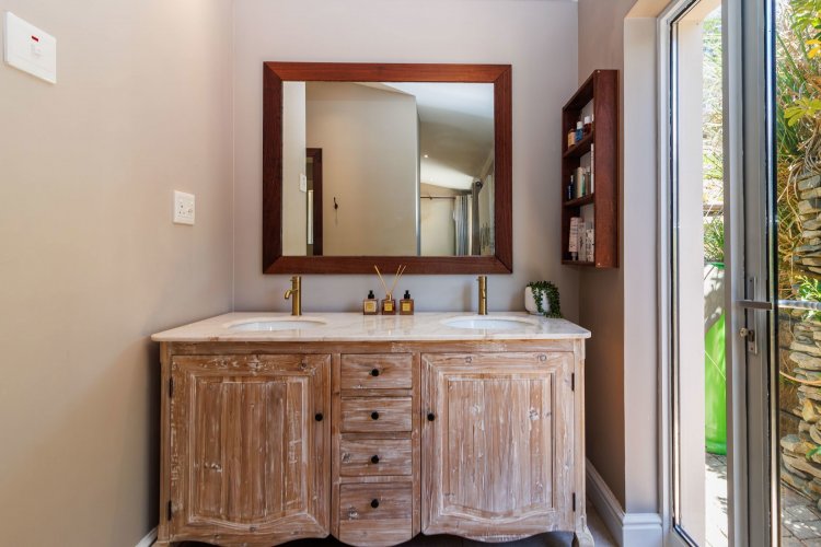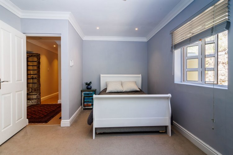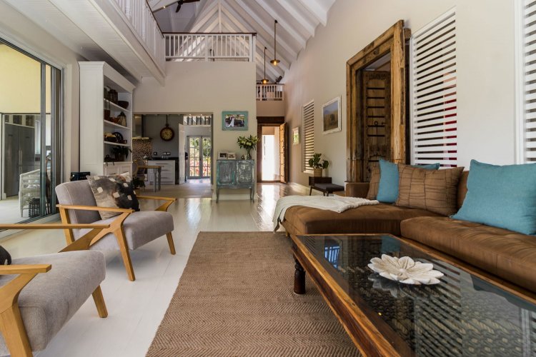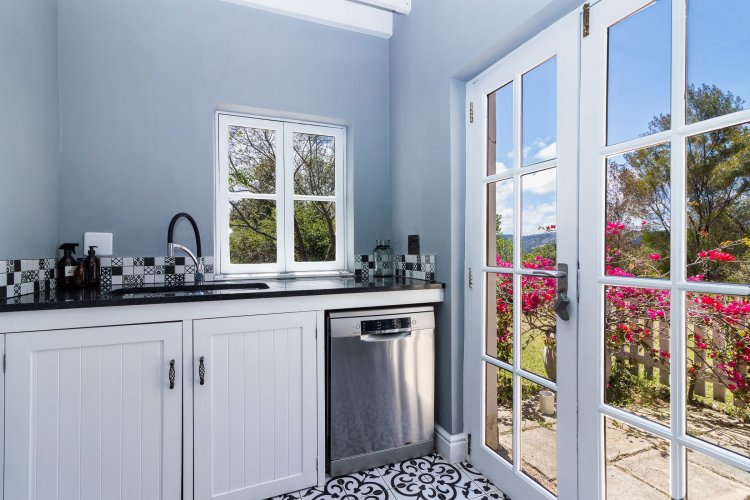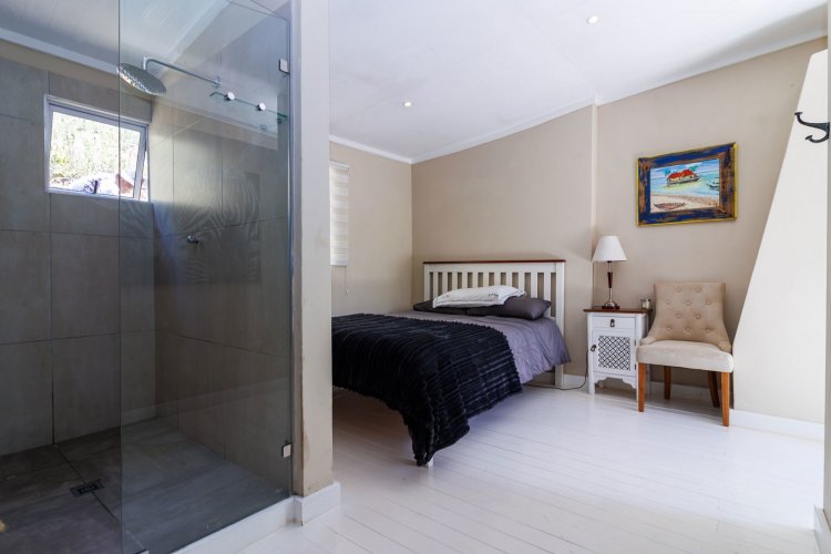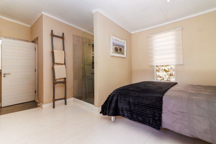 The well-designed kitchen includes a gas hob, electric oven, extractor fan, granite countertops, and tiled flooring, while a separate scullery houses two inverters and two batteries for uninterrupted power. The upper-level mezzanine offers an informal TV lounge and office, and the home features six versatile bedrooms, including one en-suite room with a private outdoor gas shower, a room on the mezzanine level ideal for a studio or office, and an external en-suite room perfect for guests, staff, or Airbnb-style accommodation.