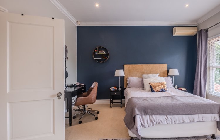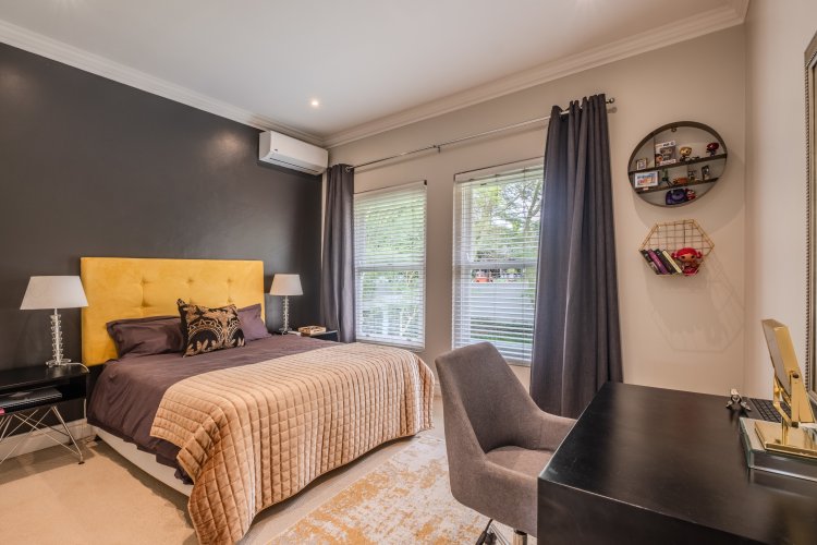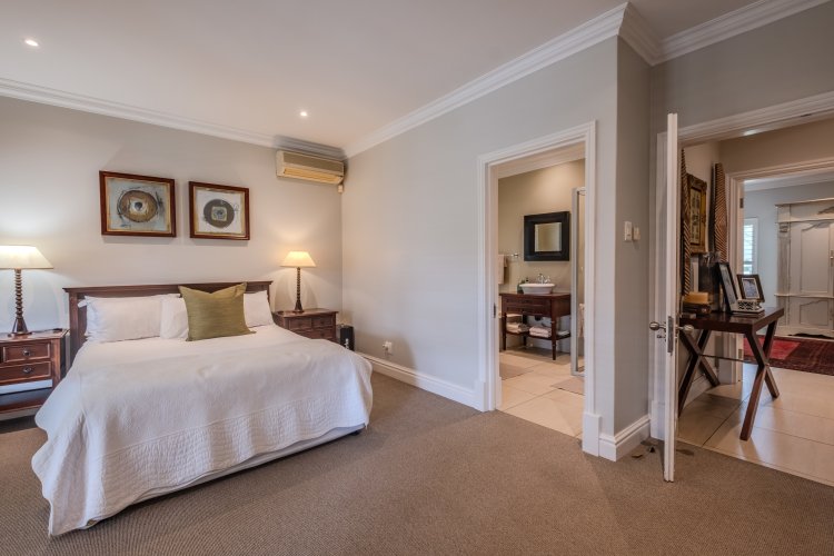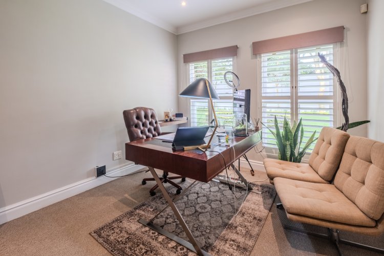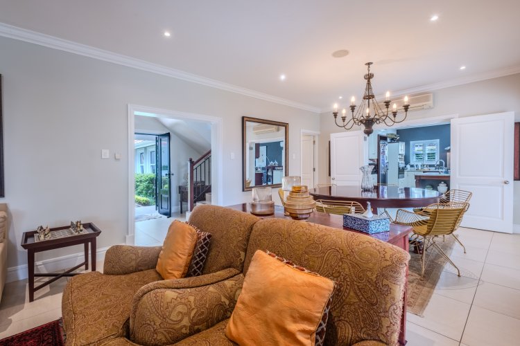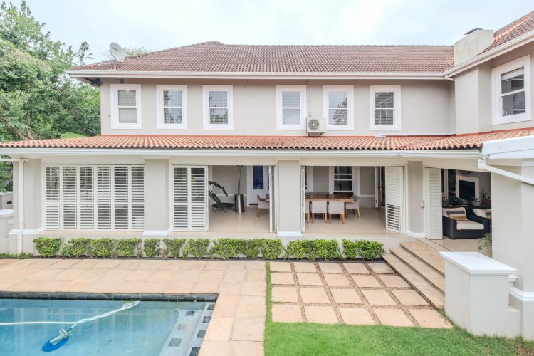 Be wowed by this exceptional double-storey home which is a masterpiece of modern design, functionality and sophistication. Every detail has been meticulously considered, resulting in a timeless, classic residence for the discerning buyer. As you enter the premises the beautifully landscaped garden takes your breath away. It features a tranquil koi pond that sets the tone for the home’s serene ambiance. The grand entrance hall leads into an expansive open-plan formal lounge and dining area, seamlessly connecting to a spacious, covered patio enclosed with folding security shutter doors—perfect for year-round entertaining. From here, enjoy seamless access to the garden, sparkling swimming pool and secluded firepit - truly an entertainer’s paradise. The TV lounge flows from the patio and adjoins the designer kitchen, complete with a central island, breakfast nook, and dedicated coffee station. The adjoining scullery leads to a glass-enclosed conservatory, connecting to a beautifully appointed laundry room. To complete the lower level there is a study and a large room which could easily be another bedroom. In addition to this there is a stylish guest suite with an en-suite bathroom which opens directly onto the patio, offering privacy and comfort for visitors. Upstairs, an expansive landing features a cozy pyjama lounge and a dedicated workspace. The luxurious main suite opens onto a private balcony from which to enjoy the ocean view. The sophisticated full en-suite bathroom offers a spa-like retreat with a double vanity and double shower. Three additional spacious bedrooms, one of which is en suite—along with one additional bathroom provide ample accommodation for family members. This gorgeous home also includes a dedicated server and inverter room, ensuring uninterrupted power supply.