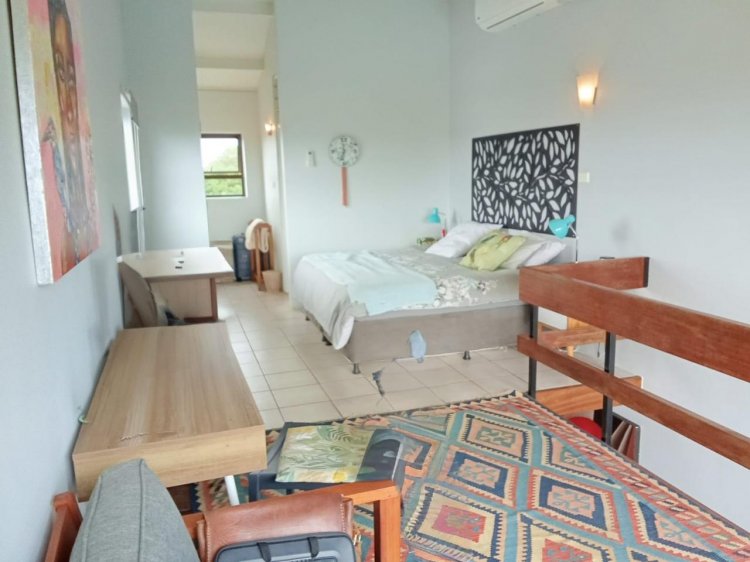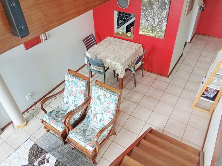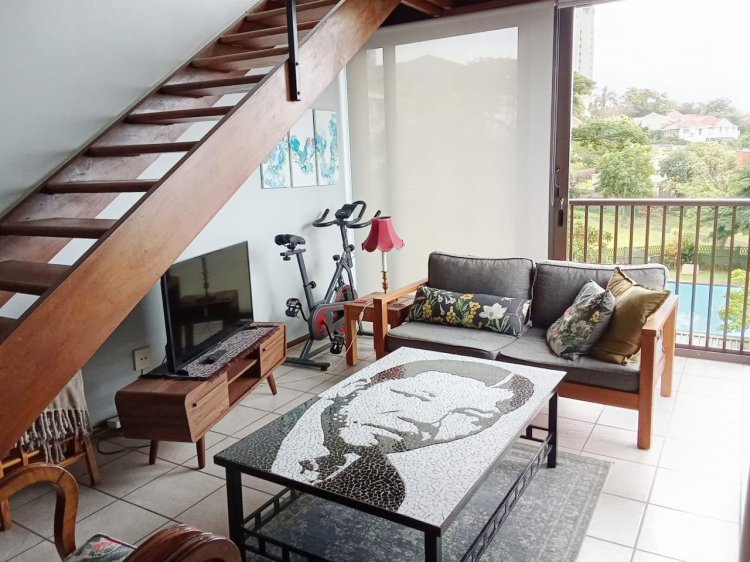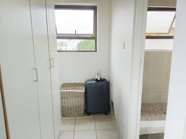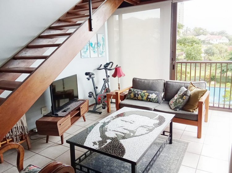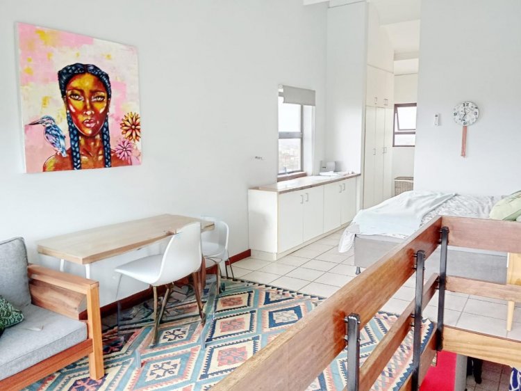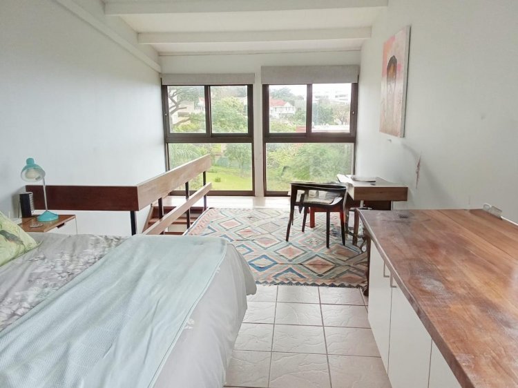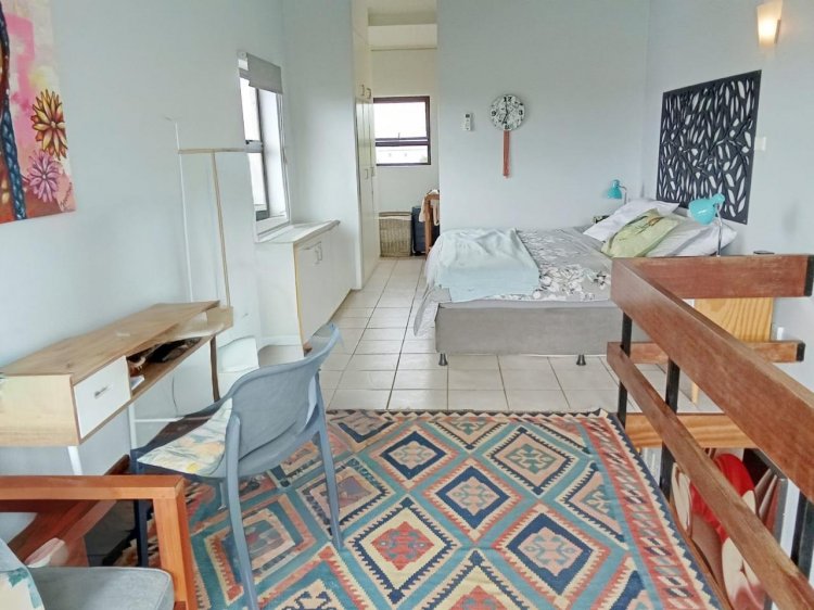 The spacious lounge flows beautifully into the open-plan dining area and is enhanced by two Juliet balconies with sliding doors, inviting in natural light and fresh air. Modern blinds throughout add a clean, elegant finish. Upstairs you’ll find a sleek, modern bathroom with a shower, basin and toilet, as well as a generously sized bedroom complete with built-in cupboards, a large air conditioner, a long dresser with additional storage, and a cozy private lounge — your own comfortable retreat.