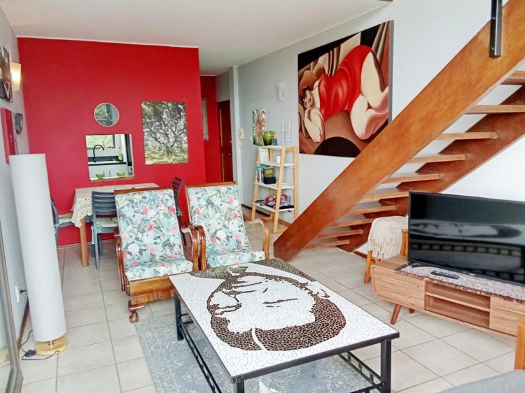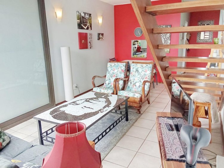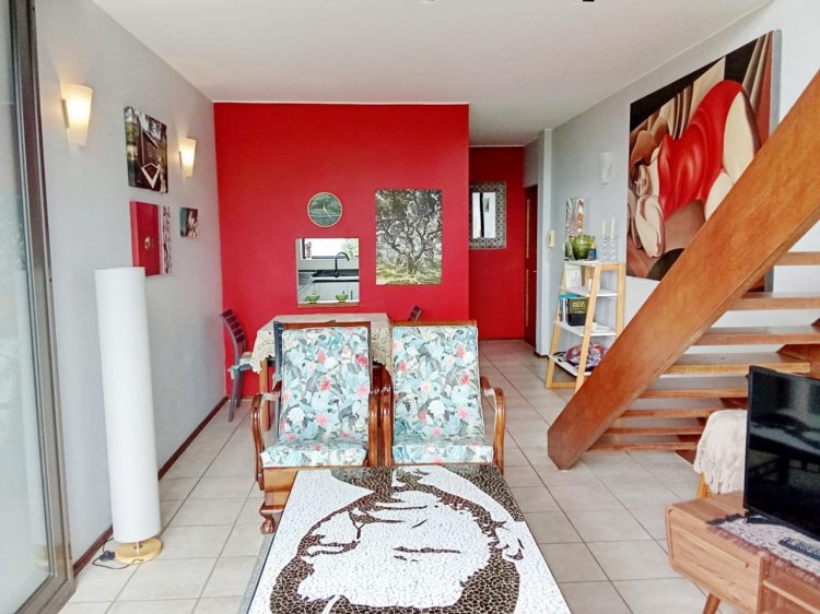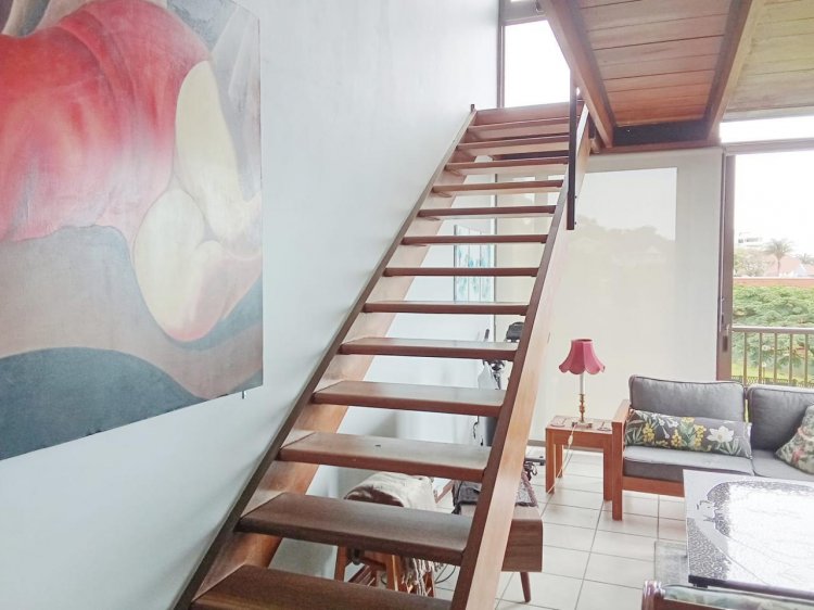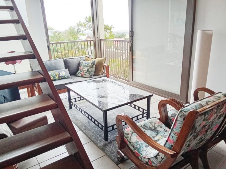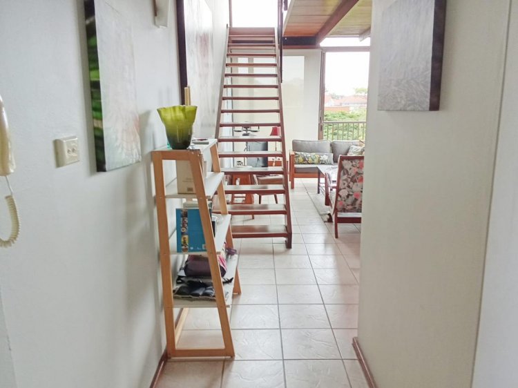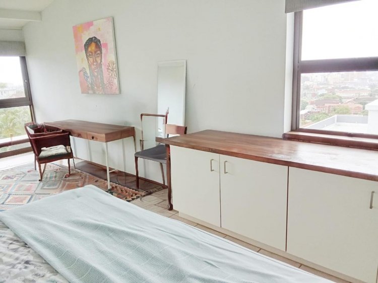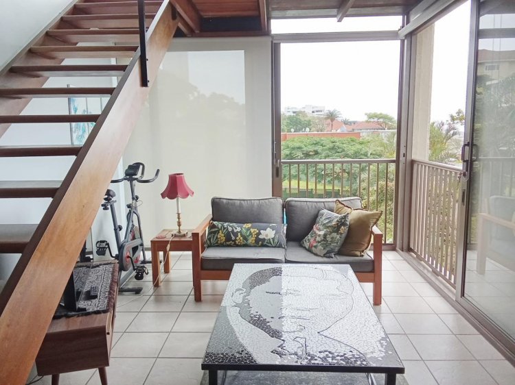 The spacious lounge flows beautifully into the open-plan dining area and is enhanced by two Juliet balconies with sliding doors, inviting in natural light and fresh air. Modern blinds throughout add a clean, elegant finish. Upstairs you’ll find a sleek, modern bathroom with a shower, basin and toilet, as well as a generously sized bedroom complete with built-in cupboards, a large air conditioner, a long dresser with additional storage, and a cozy private lounge — your own comfortable retreat.
